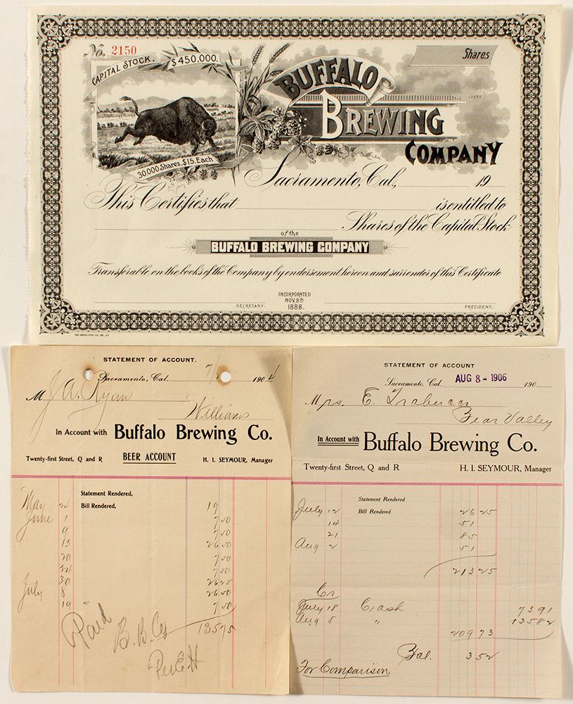 This is a lot of 2 billheads and 1 unused stock. 1) Stock no 2150, not-issued. It features the famous buffalo as a pictorial on the upper left side. 2) Statement of account, dated July 2, 1904. It was for a Mr. J.A. Ryan of Williams for a total of $135.75. 3) Statement of account, dated August 8, 1906 for E. Farber of Bear Valley. All the pieces have very little wear.City: SacramentoCounty: Sacramento CountyState: CADate: 1904-1906