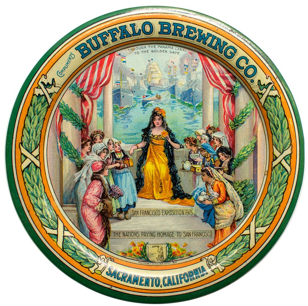 Blue text: Compliments of Buffalo Brewing Co./ Sacramento, California." Vignette of allegorical woman in gold dress with servants bowing around her. She stands in front of mural of ships going through the Panama Canal. "Through the Panama Canal to the Golden Gate." Wreath border. Kaufmann & Strauss Co., NY. Burt Collection