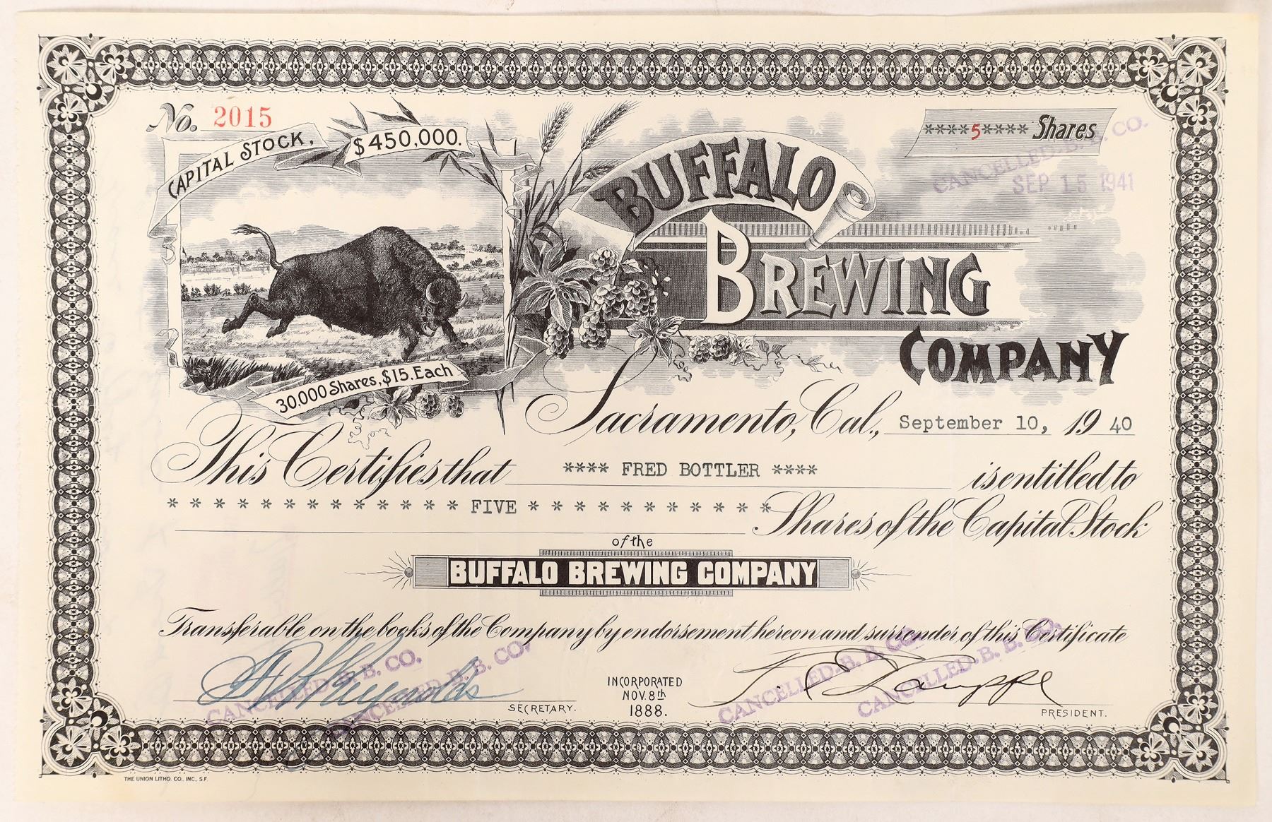 Rare issued Buffalo Brewing stock, 1940 issued to Fred Bottler, how appropriate! Buffalo vignette. Sacramento California