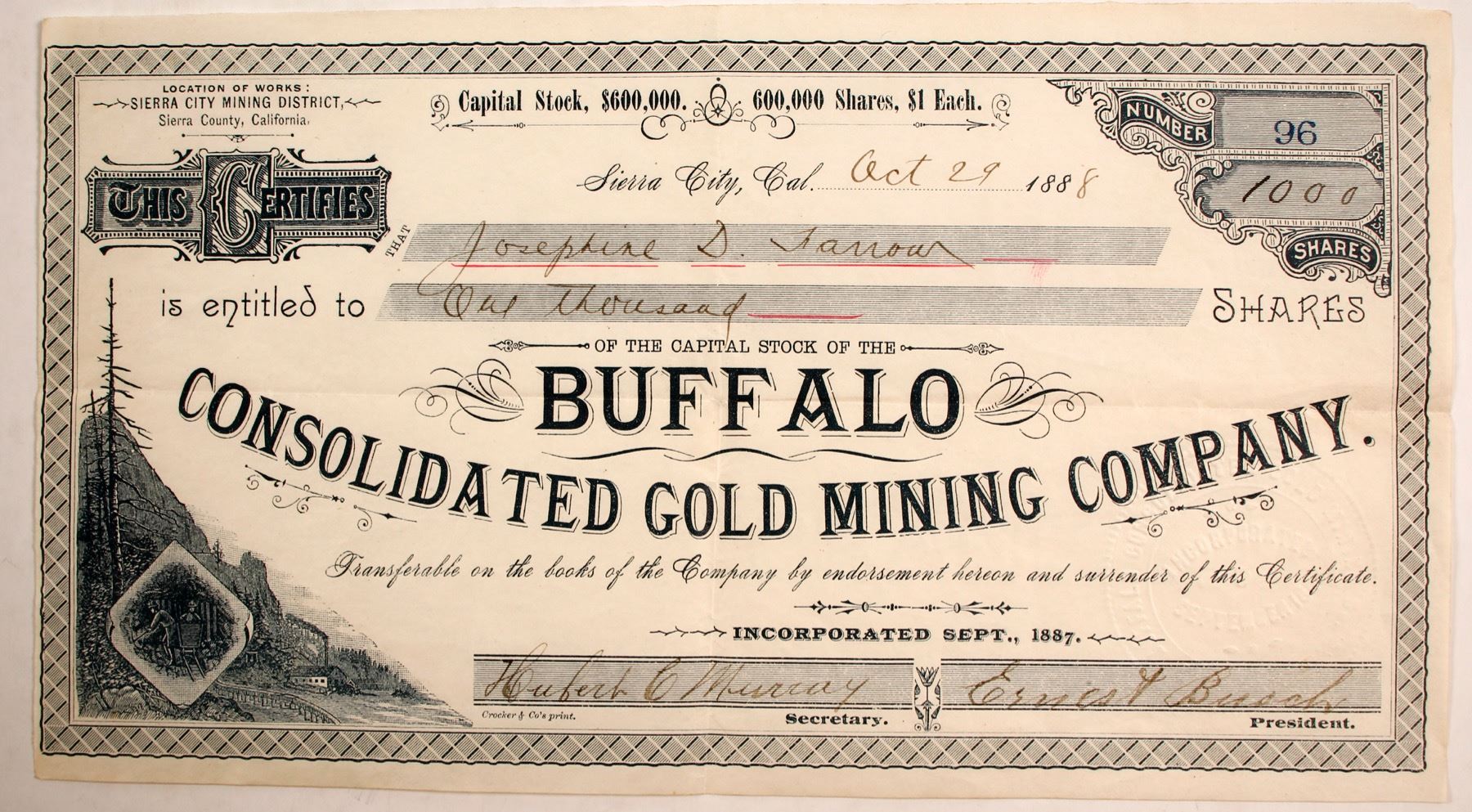 I/U #96 Josephine Farrow 1000 shares 1887 signed by President Busch. Nice "xray" underground mine vignette. Mine in Sierra Mining District. Inc 1887. Prag Collection. State: California City: Sierra County Date: 1888 HWAC# 83479