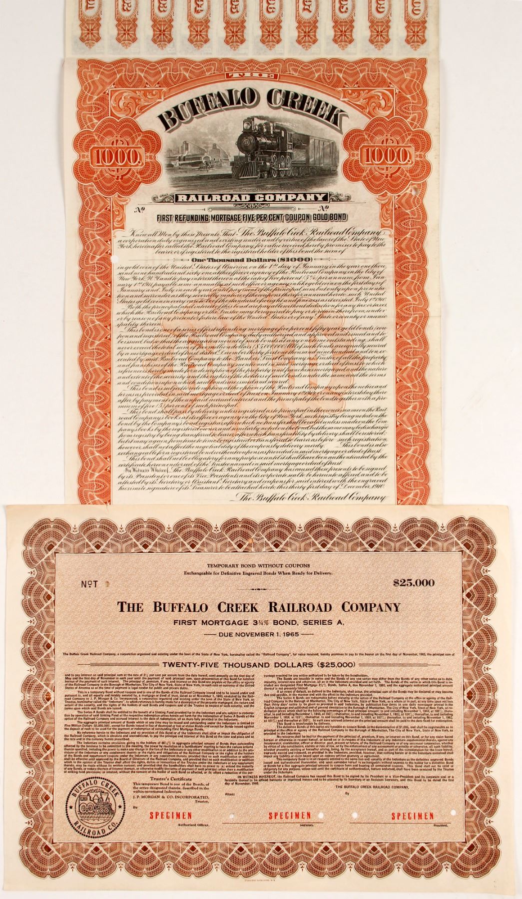 Two Non-issued Bond certificates. $1000 Gold bond. Orange-red, with all coupons attached. Probable specimen, all coupons and signature lines punched. Fine condition, slight browning at edges. 1910. New York.