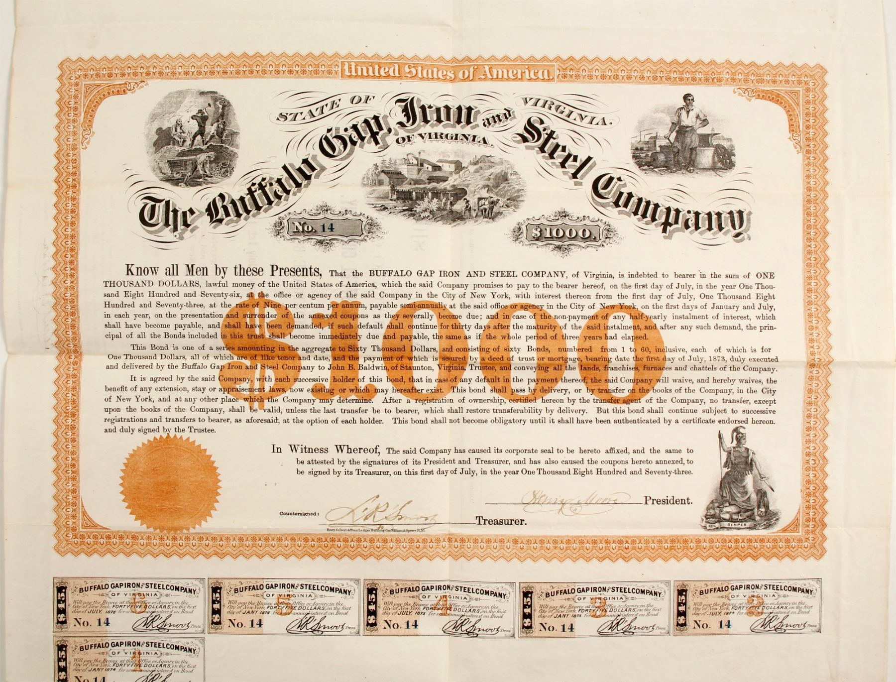 VERY EARLY # 14! $1000 bond. All six coupons still attached. Most bond are issued for periods of 5, 10, 20 or even 50 years, this bond is due in just 3 years after its issuance. 60 bonds issued for a total loan of $60,000. Four detailed vignettes, at top center miners digging with horse drawn wagon nearby and train with ore in background, top left several miners digging underground, top right man as symbol of commerce and lower right gladiator 'sic semper tyrannis' with bloody knife. That Latin phrase is what assassin John Wilkes Booth yelled after he killed President Lincoln and jumped down on the stage. It is also the Virginia state motto and means 'death to tyrants.' Signed by president Henry Moore and treasurer LR Smoot. Printed by Henry Seibert. Heavy folds and bottom is folded. Bright, colorful and very nice! Prag Collection State: Virginia City: Buffalo Gap Date: 1873 HWAC# 83945