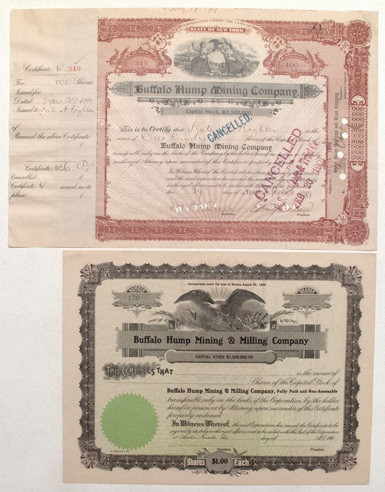 When Bert Rigley and Charlie Robbins staked out the Big Buffalo Mine, they started one of the world's last gold rushes. In April 1900, Charles Sweeney, well known in the Coeur d'Alene District, put up a mill on site and work began in earnest. A company store, bank and hospital were erected and the town named Calendar, after Thomas O. Callender. The Big Buffalo operated for about three years and shut down on March 19, 1903. 1) Buffalo Hump Mining Company. This is certificate # 349 for 100 shares to Kate Righter. 1899. Cancelled. Stub still attached. 2) Buffalo Hump Mining and Milling Company. Unused certificate # 170.