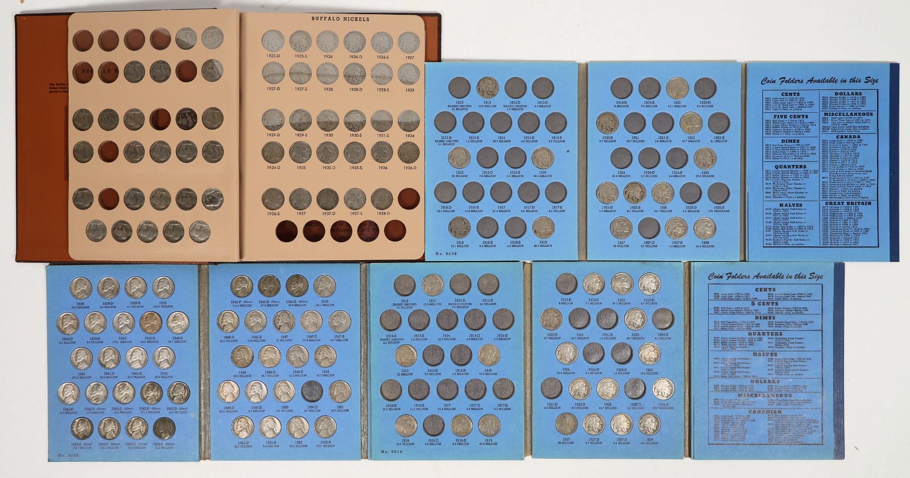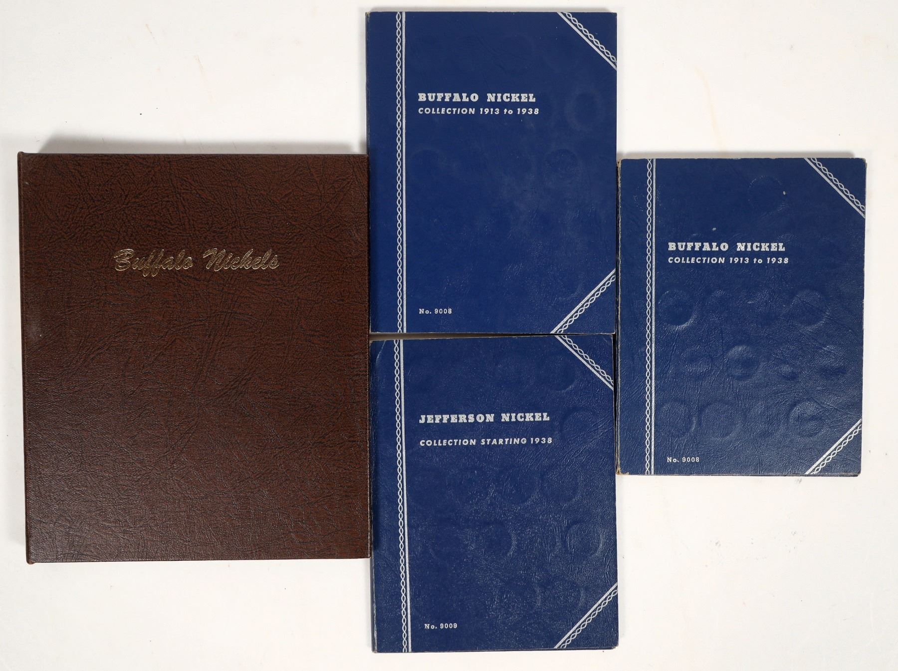 Four coin albums of United States nickels: 1) Dansco #7112; with 54 coins, coins generally G-EF condition. 2) Blue Whitman #9008 Buffalo Nickel; with 39 coins, generally G-EF. 3) Blue Whitman #9008 Buffalo Nickel; with 34 coins, generally AG-VF. 4) Blue Whitman #9009 Jefferson Nickel; with 64 coins, missing only 1950-D, generally G-AU condition. Dates and mint marks have not been verified.