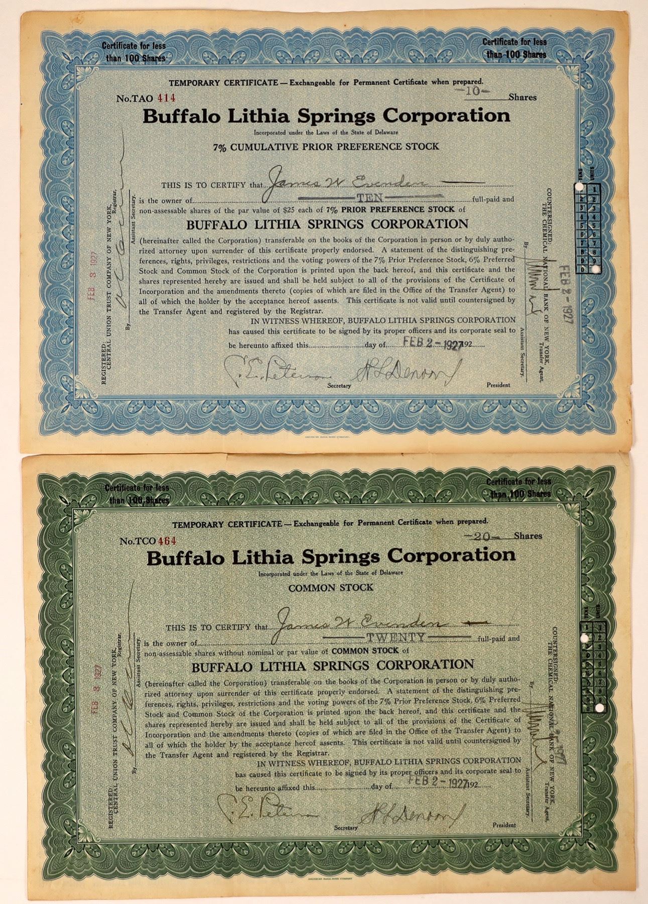 Two Buffalo Lithia Springs Corporation uncanceled stock certificates, both issued Feb. 2, 1927. Buffalo Lithia Springs is located in Buffalo Junction, VA, with company incorporation in Delaware. The certificates are: No. TCO464, temporary certificate for 20 shares issued to James W. Evenden, signed by President H.L. Denson and Secretary C.E. Peterson; and No. TAO414, temporary certificate for 10 shares issued to James W. Evenden, also signed by the President and Secretary. Both in fine condition with slight folds, some staining and very little wear. The Buffalo Lithia Springs were first brought to the attention of Colonel William Byrd by Native Americans in 1726 while he was surveying the boundary between Virginia and Carolina. Byrd called the site "Buffalo Springs", because when they arrived, they killed a local buffalo for food, which was drinking from one of the springs. The healing waters of Buffalo Lithia Springs were attracting visitors as early as 1790. Notable guests from this period were President Thomas Jefferson, General Winfield Scott, and General Santa Anna. By the 1800s it had become a popular resort. Thomas F. Goode, a former Colonel in the 3rd Virginia Cavalry, purchased the resort in 1874. Under his proprietorship the Springs achieved their greatest success, both as a destination and through the bottling of the Buffalo Lithia Water, which was sold in London, Paris and Havana. Mary Anna Morrison Jackson, widow of Confederate General Thomas "Stonewall" Jackson, was a guest during the Springs' "heyday", spending much of the 1899 season there. By the 1930s mineral water was no longer prescribed by physicians, and the resort/spa closed due to declining profits.