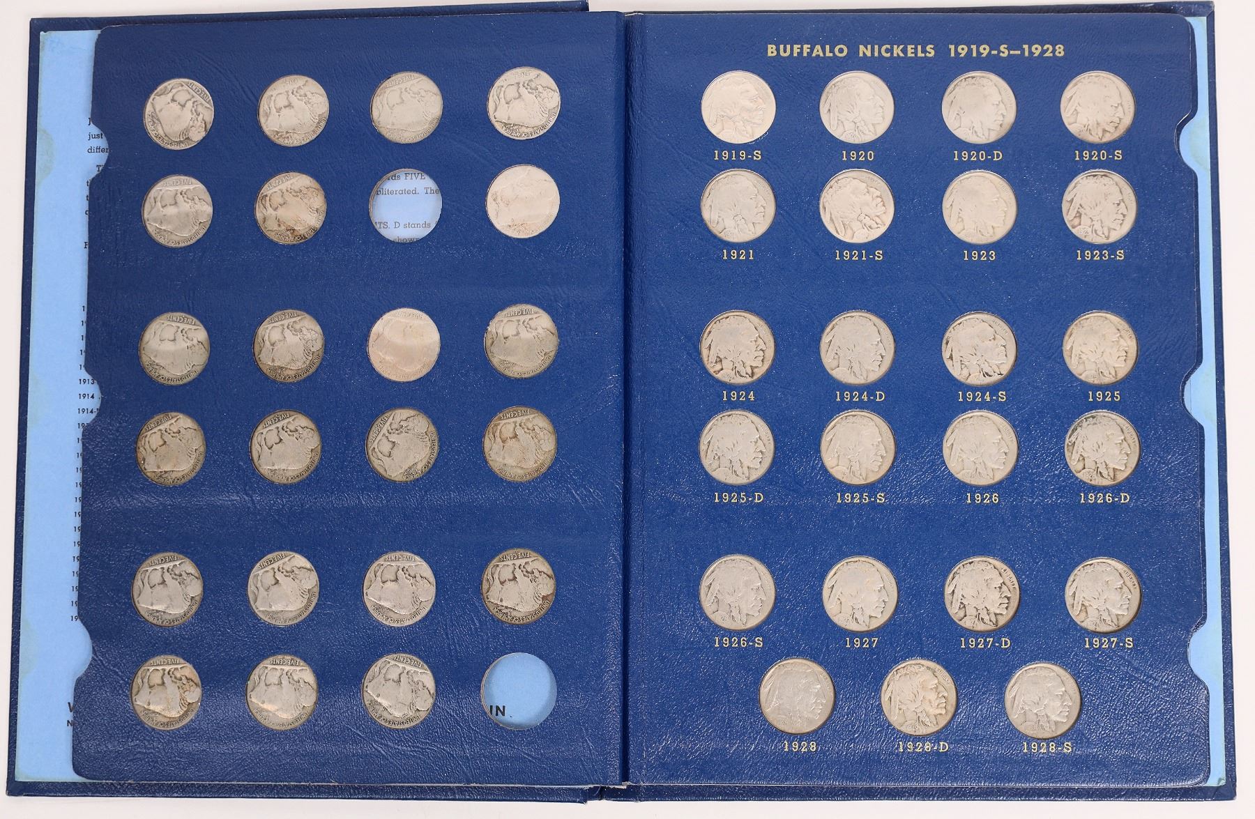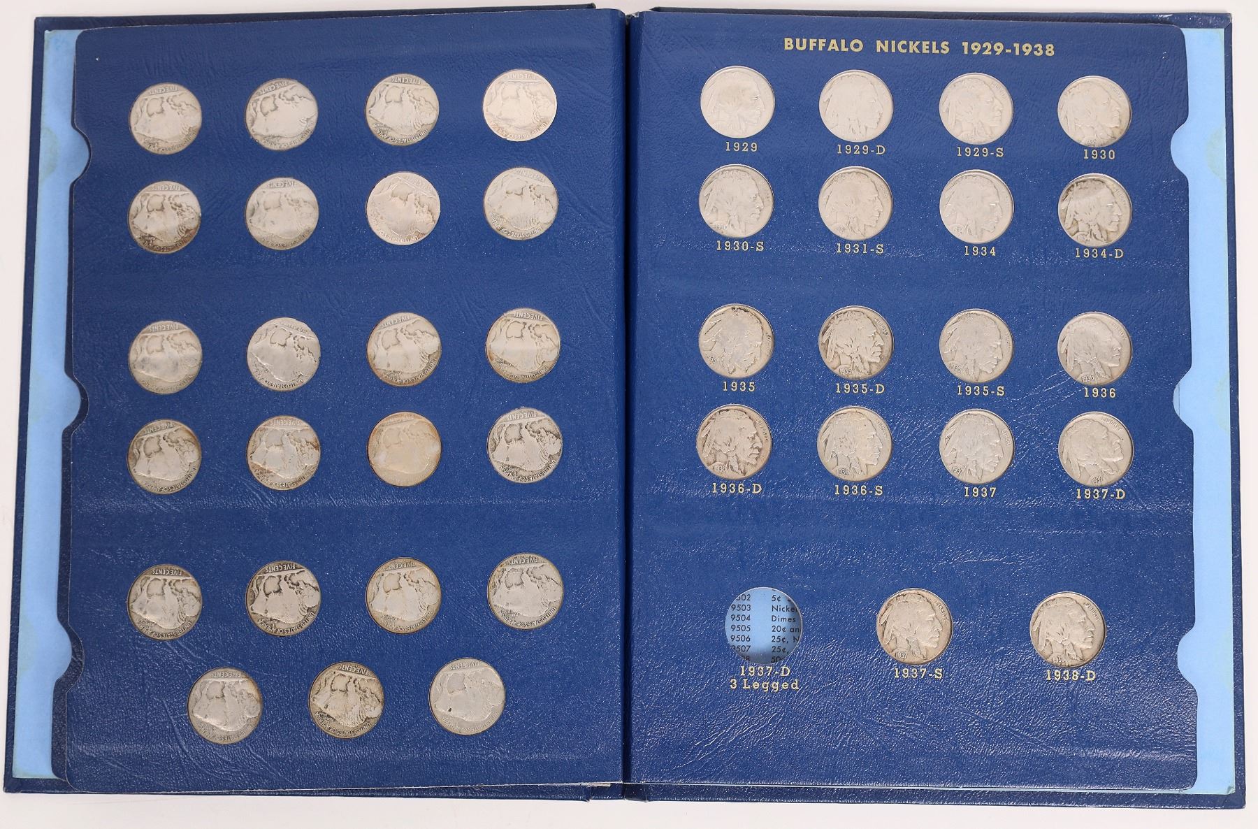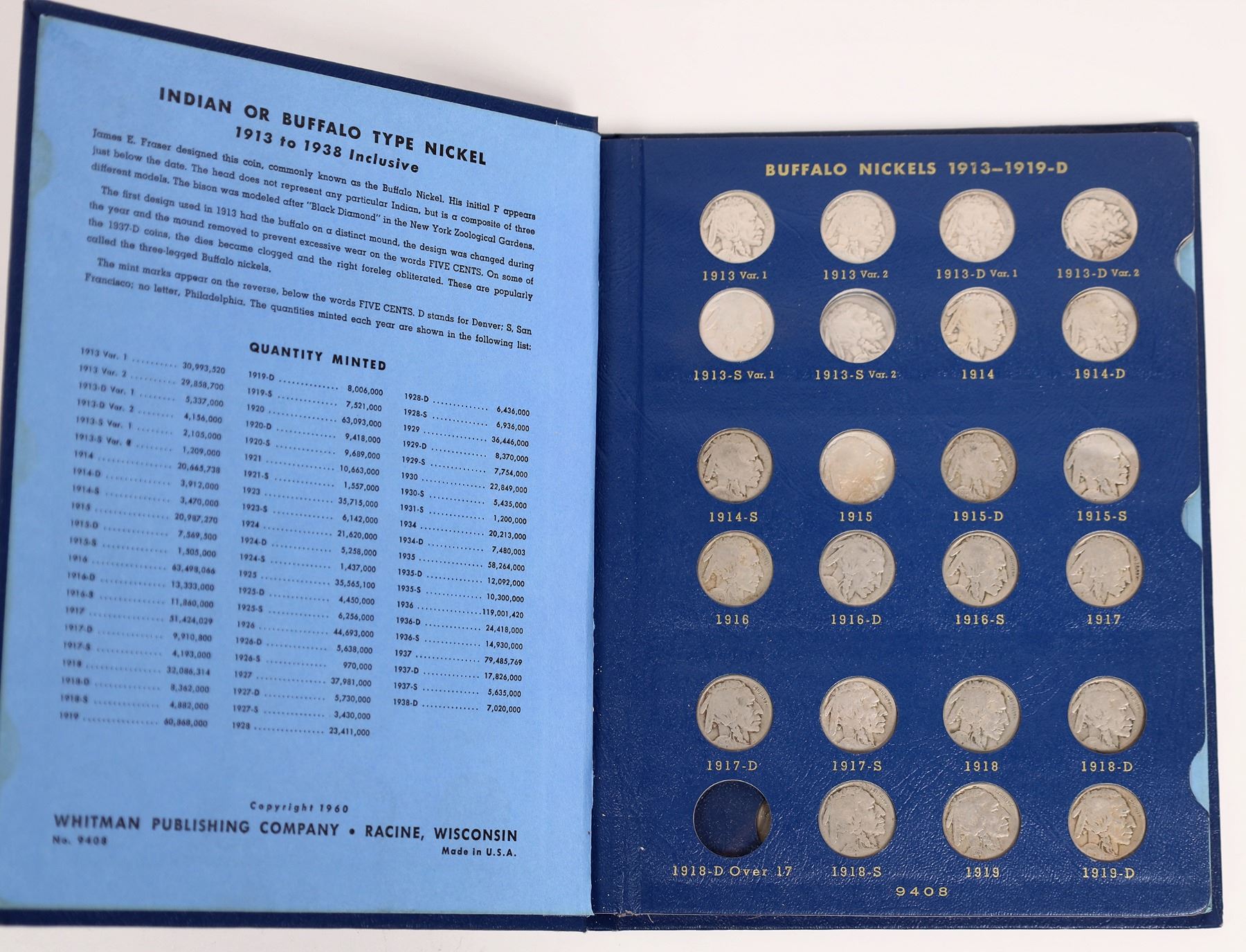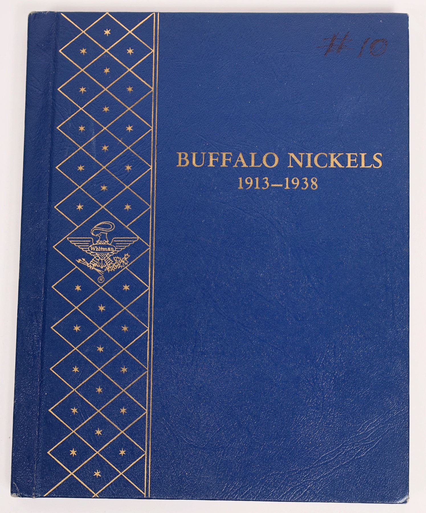 Whitman blue album No. 9408: Buffalo Nickels 1913-1938. Nice set, coins are average circulated condition; most key dates are present, missing only 1913-S type II, the 1918-D over 17 overdate and the 3-legged variety.