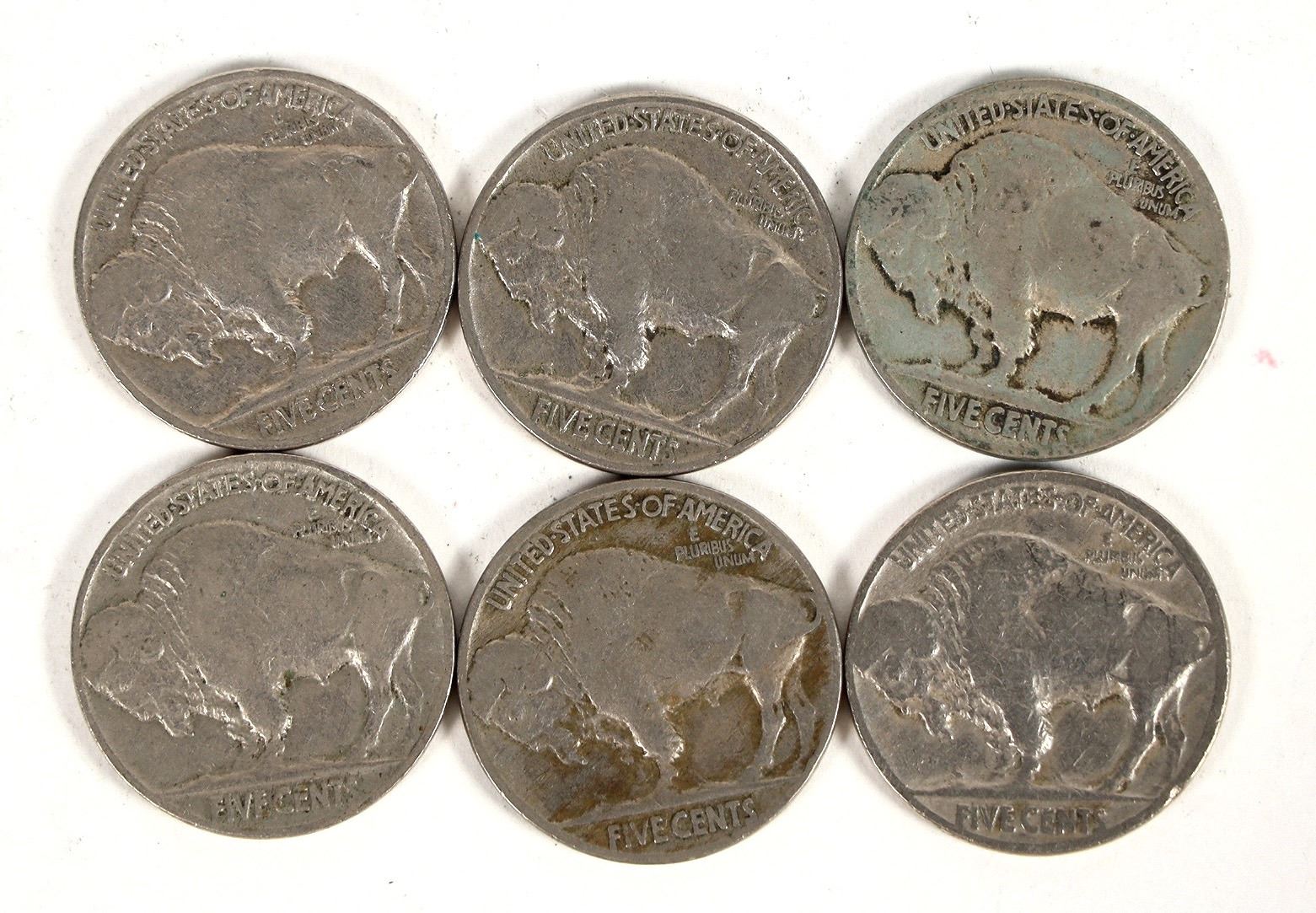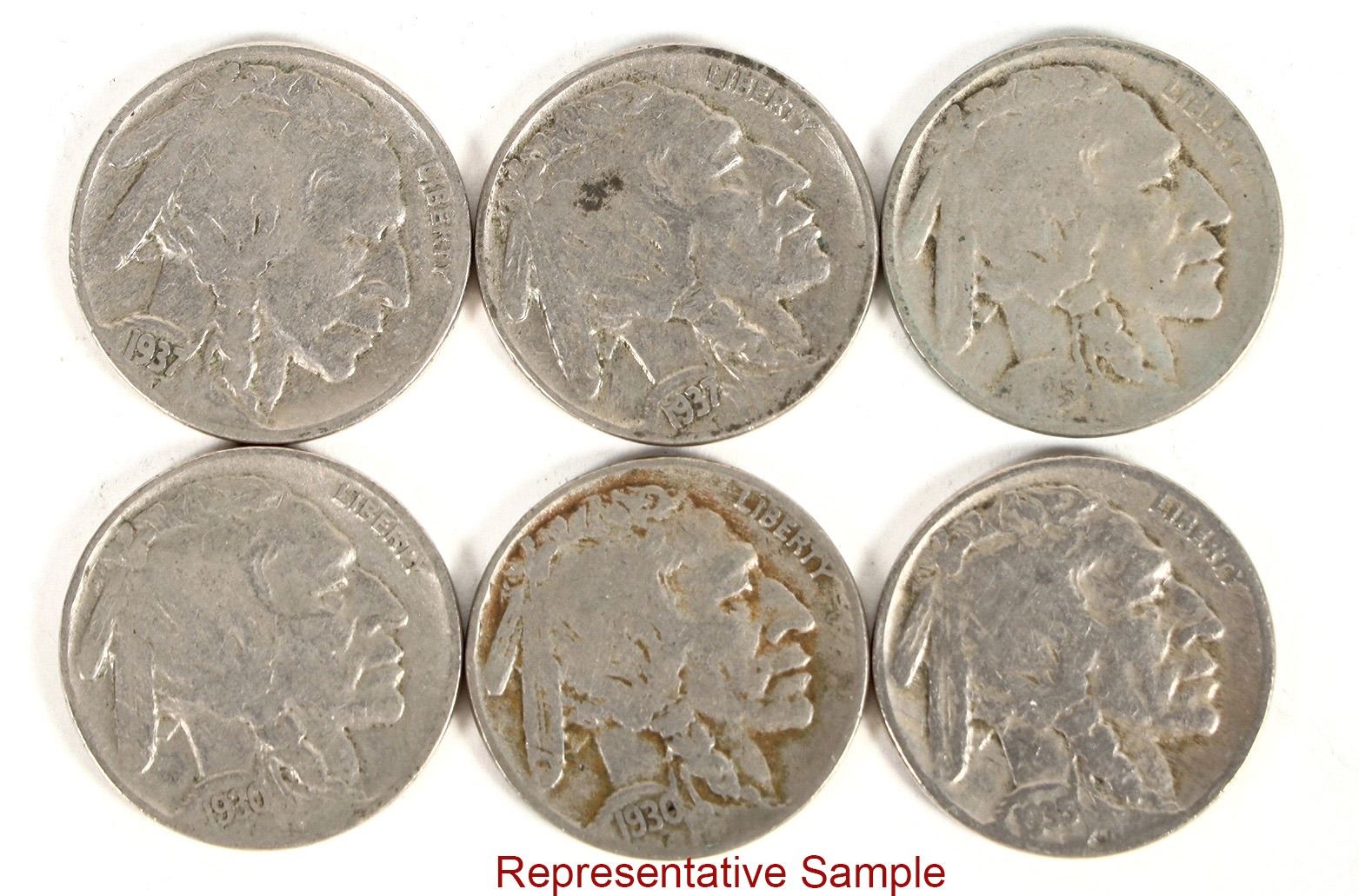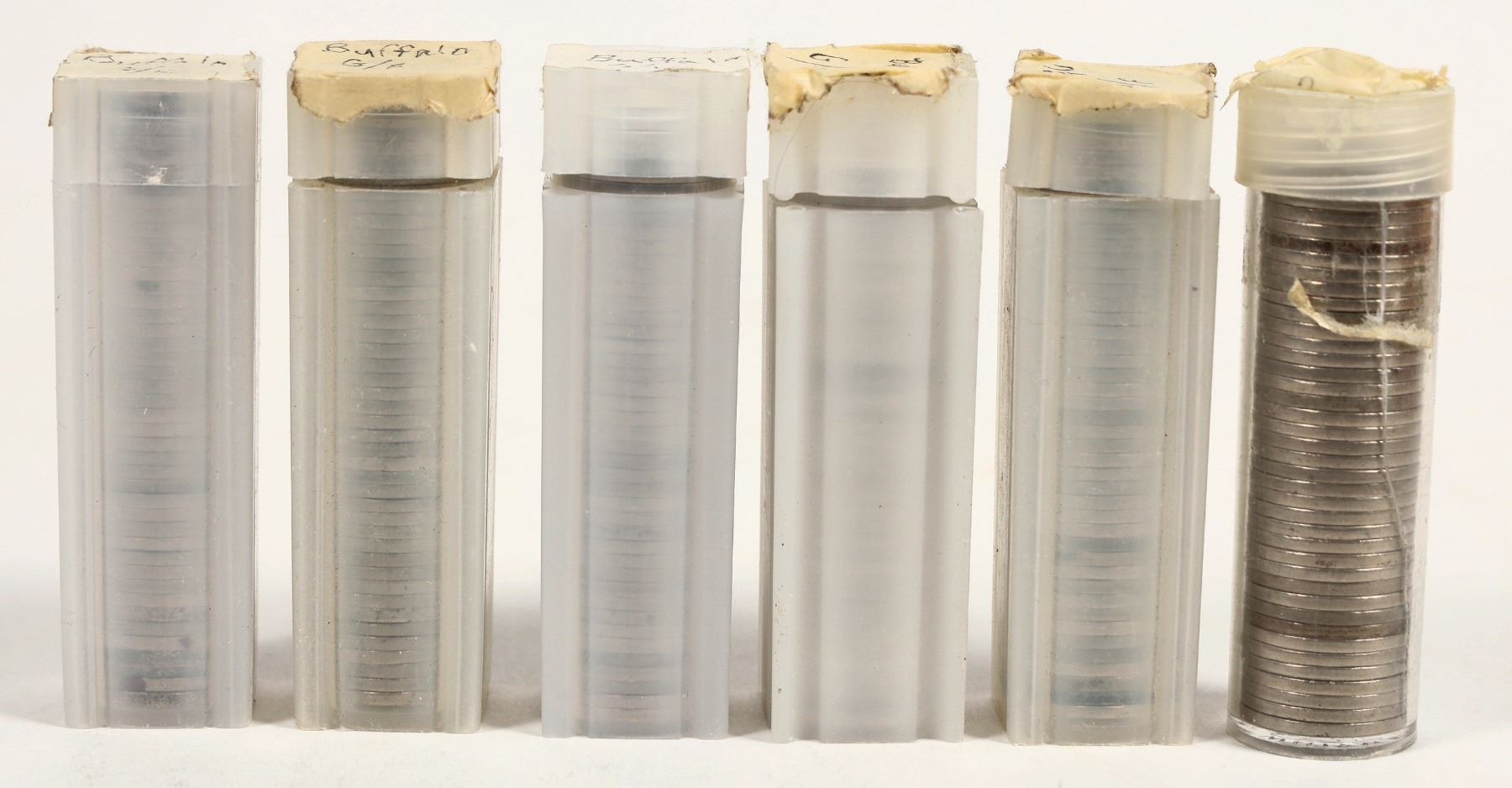 Six rolls of Buffalo nickels in good to fine condition. Three of the rolls have a couple extra coins.