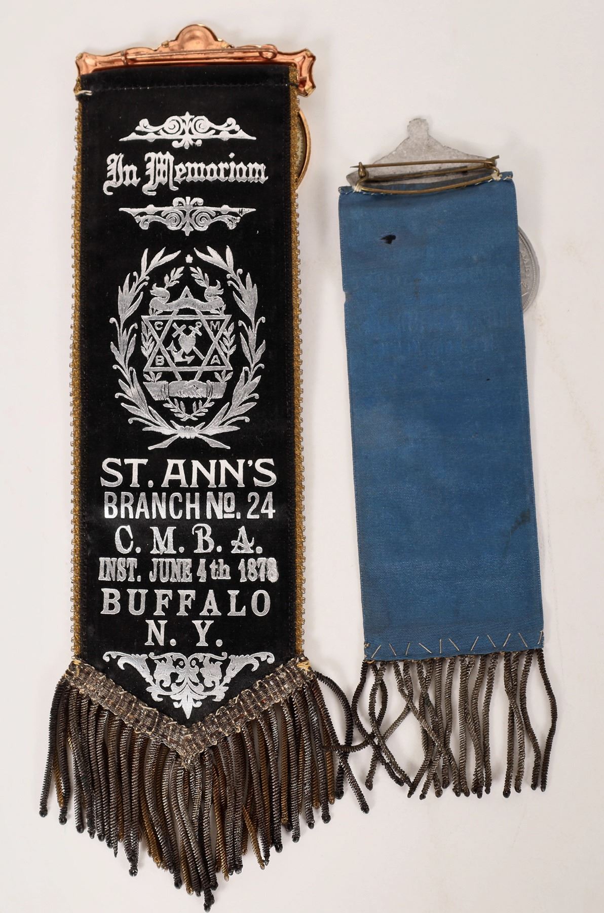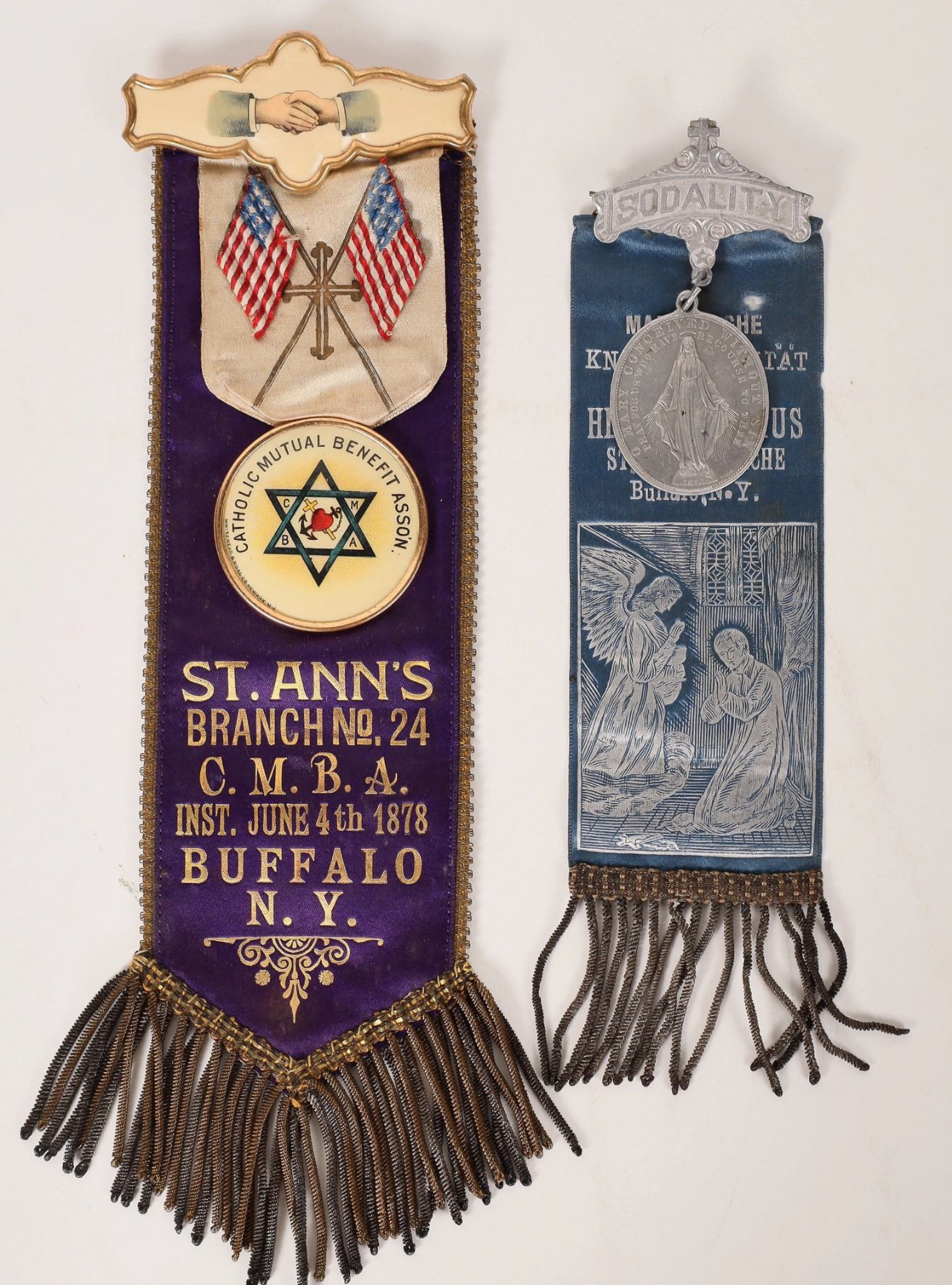 Lot of two: 1) Catholic Mutual Benefit Asso'n / St. Ann's / Branch No. 24 / C. M. B. A. / Inst. June 4th 1878 / Buffalo / N. Y.; enameled hands clasping, American flags, 2 1/2 x 9 inches, purple with gold lettering. 2) Marianische / Knabensodalitat / vom / H. L. Stanislaus / St. Anna Kirche / Buffalo, N. Y. Blue with silver lettering; 2 x 7 inches. New York Buffalo