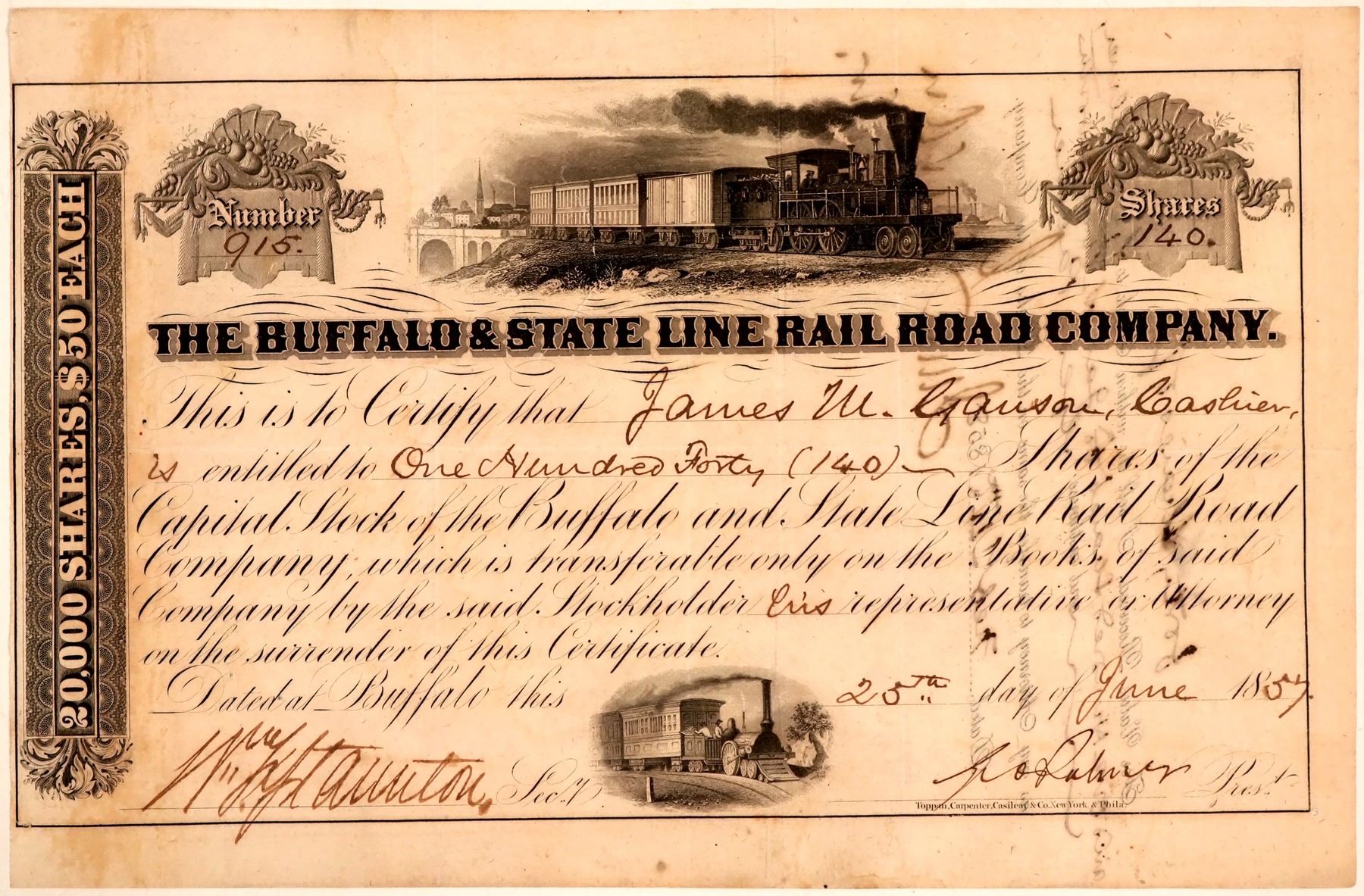 Cert. #915, issued for 140 shares to James M. Gauson, Cashier in 1857. Signed by the president and secy. Train at top running left to right. Uncancelled. This is rare and there are no known examples of this certificate not being cancelled in Cox. Black print. Shares were $50 Each. Topper, Carpenter, Casilean & Co., New York & Phila. printer. The shares were transferred however in 1858, as issuee endorsed it on the back.