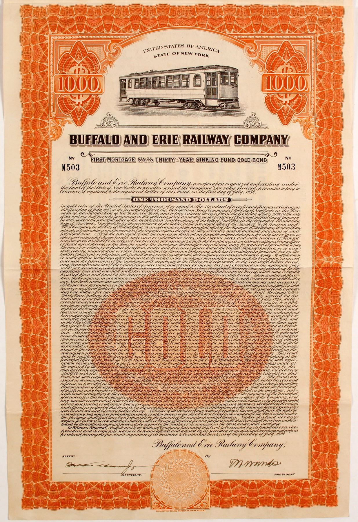Unlisted First Mortgage - 6/12%, 30-year Sinking Fund Gold Bond number M503, due July 1, 1954 with coupons. On April 14, 1832 the Buffalo and Erie Railroad, was incorporated tor run from Buffalo, NY to the Pennsylvania state line. The Panic of 1837 caused the demise before any track was laid. Printed Hamilton Bank Note Co., Ken Prag Collection.