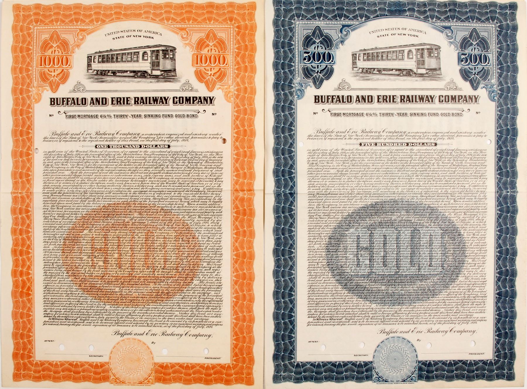 Two Unlisted Buffalo and Erie Railway Company First Mortgage Trustee Certificate 6-1/2%, 30-year Sinking Fund Gold Bond due July 1, 1954. The Erie Railway originally ran between New York City and Buffalo moving west. Printed by Hamilton Bank Note Co, Probably specimens. 1) $1,000 2) $500. Ken Prag Collection. State: City: Date: HWAC# 83150