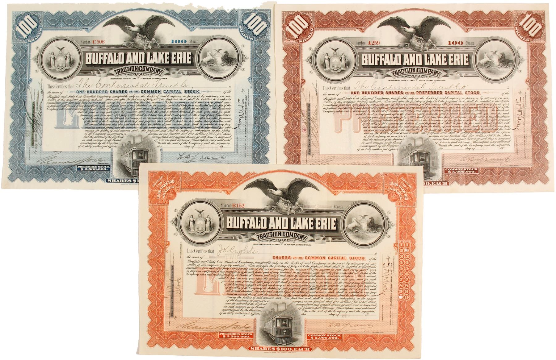 Three shares of Buffalo and Lake Erie Traction Company stock, two unlisted. Printed by American Bank Note Company. 1 )two shares number B152 dated September 18, 1907 2) 100 shares number A259, dated September 17, 1907 3) 100 shares number C506, dated September 17, 1907. The Buffalo & Lake Erie Traction Co. was the owner of several lines including the Buffalo & Lackawanna Traction Co. and Hamburg Railway serving the Buffalo, NY area. Printed by American Bank Note Company. Ken Prag Collection. State: City: Date: HWAC# 83149