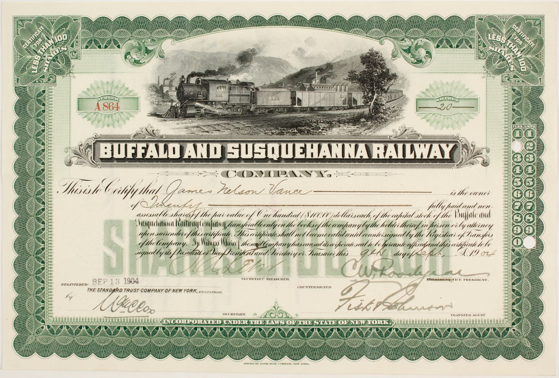 Issued and uncancelled 20 shares of Buffalo and Susquehanna Railway Company, number A864 issued to James Nelson Vance, dated September 13, 1904. Operated in western and north central Pennsylvania and western New York. The joining of logging railroads around 1893 lead to its' creation. In 1929 purchased by the Baltimore and Ohio Railroad. Nice condition. Printed by American Bank Note Company. Ken Prag Collection.