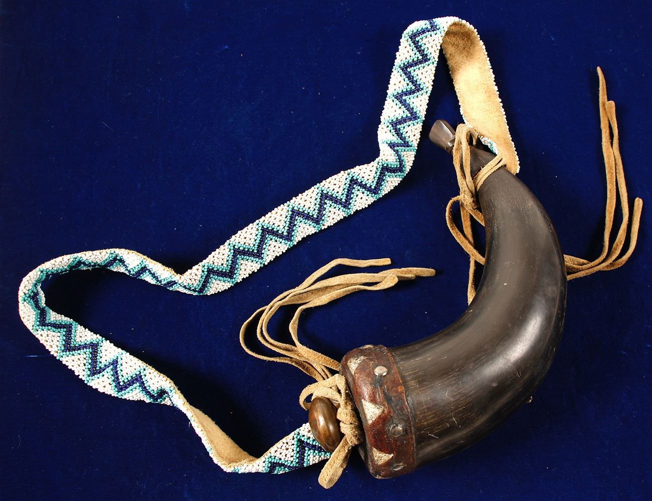 This buffalo horn powder horn is 14 in. overall length with a 33 in. beaded carry strap. The date of origin is believed to be 20th century. It could have been made earlier however this horn has never been used and was probably built as a trade goods item for a muzzleloading rendezvous. The horn is hand formed as expected with a wood base plug covered in parfletch leather attached with period steel tacks. The leather carry strap is vegetable tanned leather covered in white, cobalt blue, and turquoise seed beads. The beading process is a peyote stitch applique and very well executed. This beading technique is specialized and was completed by an experienced beader. The color associated with the white beads indicate an earlier type of imported Chech. color. This would make a fine addition to our muzzleloader shooting gear or for the re-enactor. Date: Location: HWAC# 56237