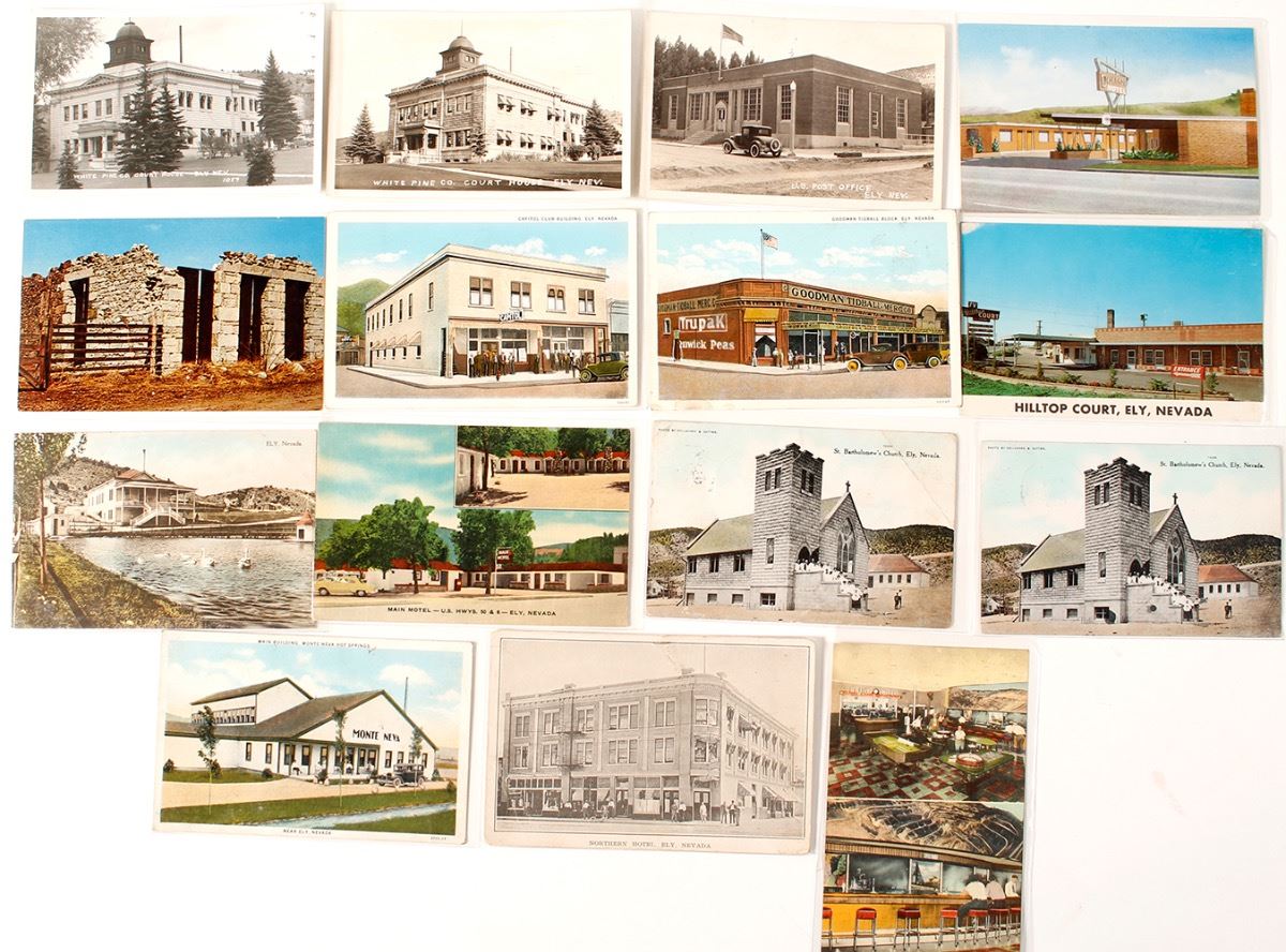 Lot of 15 cards: White Pine County Court House, U.S. Post Office, Deserset Motel, Ft. Schellbourne, Capitol Club Building, Goodman-Tidball Block, Hilltop Court, and others. City: Ely State: Nevada Date: ID# 44760