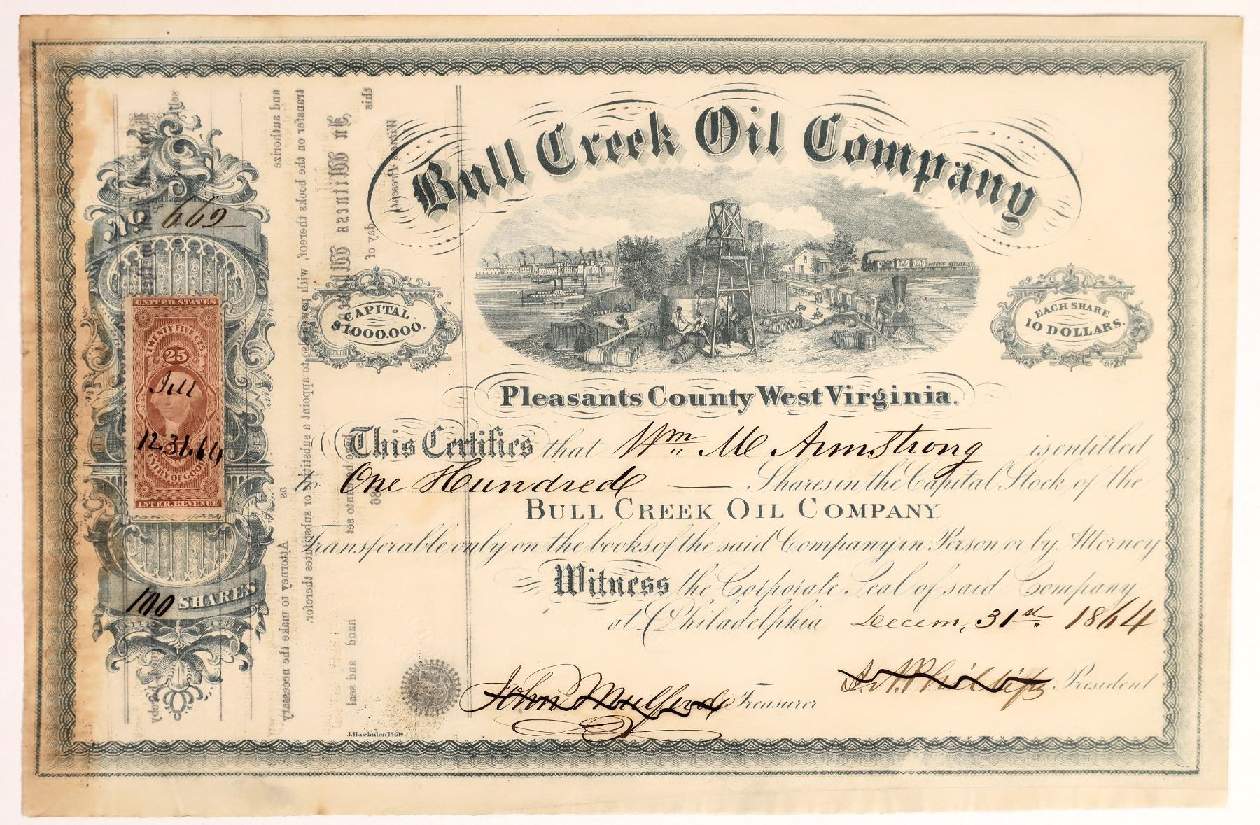 "Pleasants County West Virginia" printed under vignette. No. 662, issued for 100 shares to William Armstrong in Philadelphia in December 1864. Signed by president Phillips and treasurer John Muller. Pen cancelled. Blue gray border and print with detailed vignette of oil derrick, locomotive, and steamboat. Printed by J. Haebulon, Philadelphia. 25 cent US IR stamp attached on the left border. Wrinkles around edges, discoloration on left side. 7.25 x 10.75" Operated the Richards Well. On June 20, 1863, at the height of the Civil War, Pleasants County was one of fifty Virginia counties that entered the Union as the state of West Virginia.