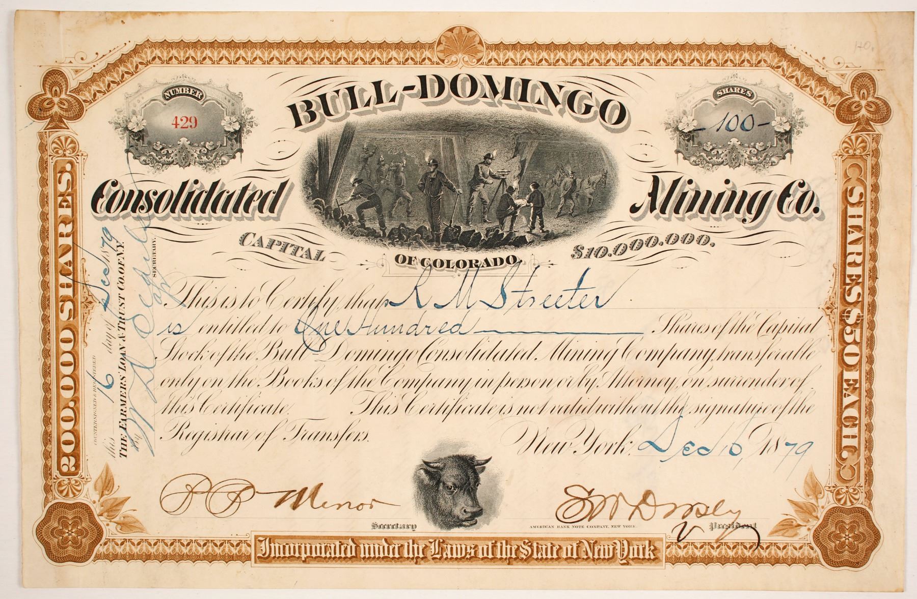 #429 for 100 shares to RM Streeter. Signed by PP Minor and vice president EM (?). Not cancelled. Underground mining vignette. Small bull mining vignette. American Bank Note Company printer. Important mine in the Italian Mountain at Dorchester. State: Colorado City: Dorchester Date: 1879