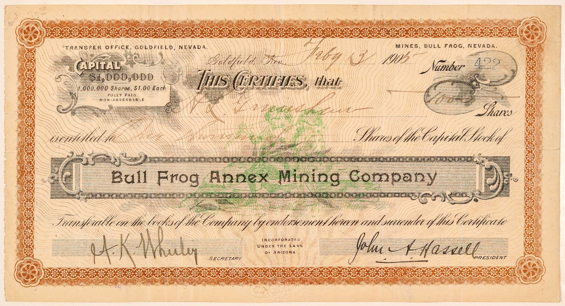 Rare! Inc. in AZ. No. 422, issued for 1,000 shares to HL Grinshaw on Feb. 13, 1905 in Goldfield. Signed by president John A. Hassell and secretary Wheeler. Not cancelled. Brown border, black print. Underprint vignette of two bullfrogs in green. Pinholes, folds, soiling. 5.25 x 10" Captain John A. Hassell was active in Goldfield and Humboldt County mines. The Bull Frog Annex was one of over 200 mines that incorporated “bullfrog” in its name. There is no information on production from this mine [Ref: [Southern Nevada: The Boomtown Years. http://digital.library.unlv.edu/u?/snv,4652]. Not in Filer or Holabird indexes. Ken Prag Collection