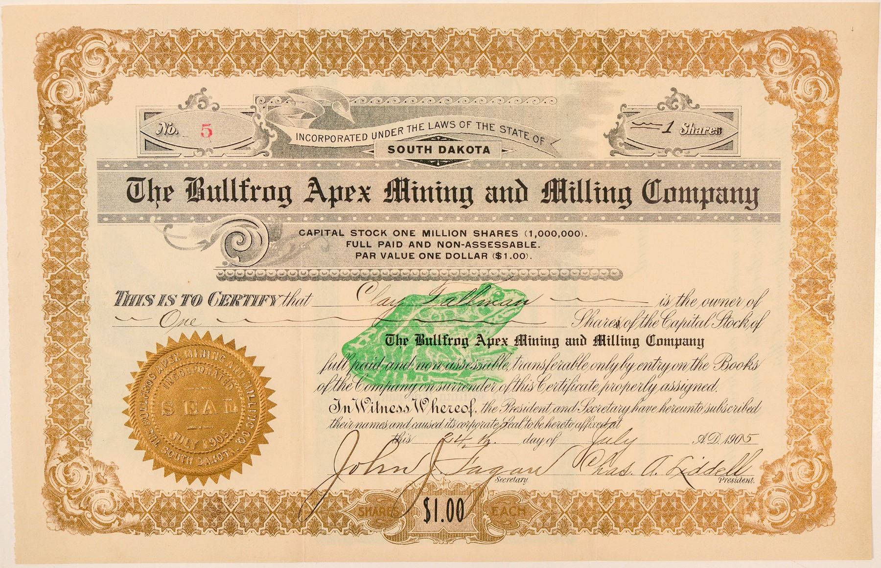 Rare Bullfrog stock! Low number 5, issued in 1905 for one shares to Clay Tallman. Signed by Fagan as secretary and Chas. A. Liddell as president. Not cancelled! Green frog vignette and ornate gold border. Folds, some other light wear. Incorporated on July 1905 in the state of South Dakota by a group of promoters headed by J.J. Fagan and E.L. Andrews, the company promoted itself as the owner of 15 claims, only one of which was ever worked -- the North Bullfrog. There was a problem with the North Bullfrog claim as it intruded into the boundaries of the Delaware claim of the West Extension Company. Though the Apex Company knew about these conflicting boundaries when the North Bullfrog claim was filed, they forged ahead anyway. Work on the Apex ground started in the fall of 1905. In a race for other nearby companies, the Apex encountered encouraging ore values and stock sales were adequate. Confident in their claims, the promoters decided to apply for a patent, which resulted in the West Extension Company to file a lawsuit against Apex. Though the dispute was tied up the courts, both companies continued to develop shafts and tunnels. But, when the Apex Company uncovered a vein of gold assaying $251 to the ton, the question was settled, and the legal battle intensified. With all the news of the legal battles, Apex suffered in the stock market and by May,1906, its stock had fallen completely off the trading board. In the end, the Apex company lost their contest for the disputed ground and soon went out of business. Ken Prag Collection