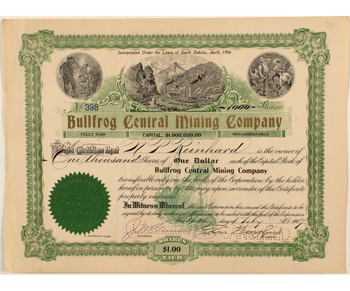 1907. Incorporated under the laws of South Dakota, April, 1906. Certificate #398. Punch cancelled thru signatures. Issued for one thousand shares to N.P. Reinhard on Feb. 4, 1907. Signed by Geo. Wingfield (president) and J.M. Fenwick (secretary). Printed by B. Rotholtz-55039. Three vignettes: three miners inspecting ore underground (top left), buildings next to mountains and river (center) and four miners working underground (top right). Green border with black and gold lettering. Light toning around edges. Small wrinkle bottom left corner, otherwise nice certificate. Listed in the Goldfield Business Directory (1907-1908) as having offices located at 9 Nixon Block. Unclear if this Geo. Wingfield is the famous Wingfield, but this is likely.City: BullfrogCounty: NyeState: NVDate: 1907