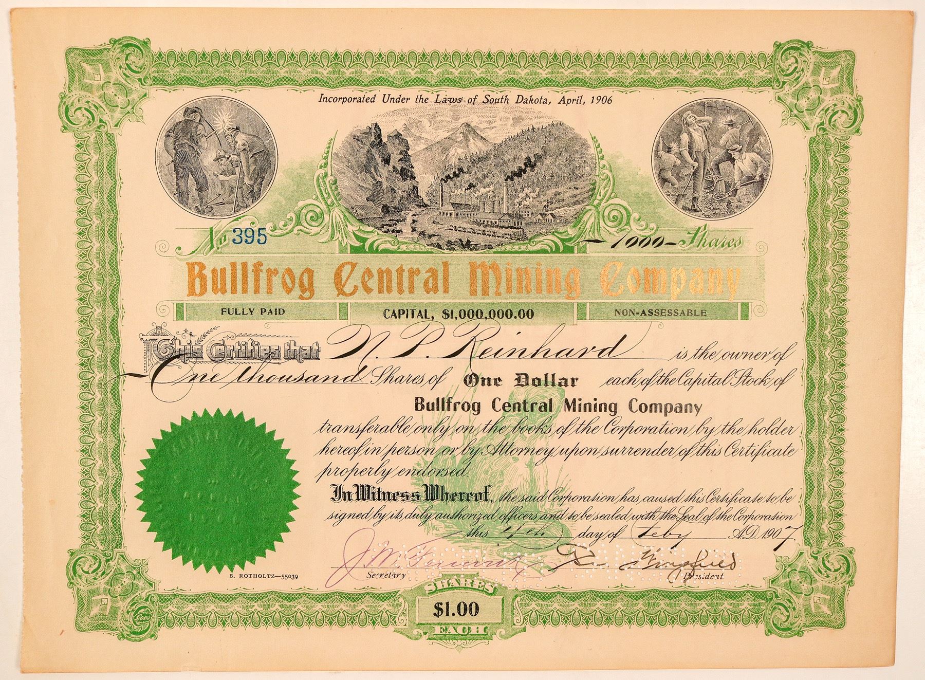 Inc. in South Dakota, April 1906. No. 395, issued for 1,000 shares to NP Reinhard on Feb. 4th, 1907. Signed by Nevada mining and banking magnate George Wingfield as president and the secretary. Punch cancels through signatures. Green border and seal, background vignette of frog. Gold title and black print. Three different mining vignettes. Printed by B. Rotholtz. 8.25 x 11" Folds, some toning. Listed in the Goldfield Business Directory (1907-1908) as having offices located at 9 Nixon Block. Very rare! Ken Prag Collection