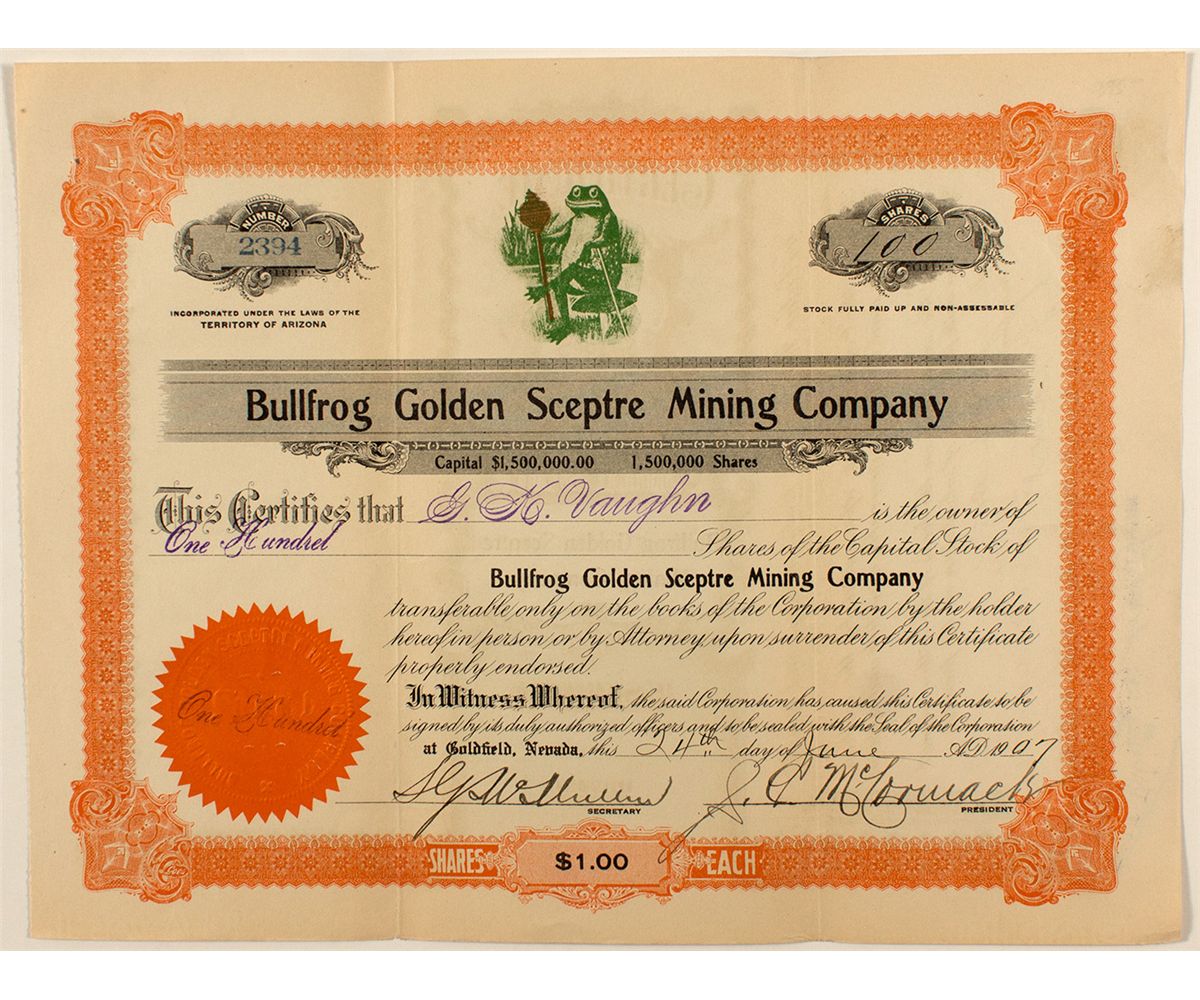 1907. Clean and uncancelled certificate with the famous frog vignette. Incorporated under the laws of the Territory of Arizona. Uncancelled. Certificate #2394. Issued for one hundred shares to G.K. Vaughn on June 24th, 1907. Signed by J.C. McCormack (president) and Sly Williams (?) (secretary). Orange border and seal with black and purple printing. Top vignette of frog holding sceptre. Signed on reverse. Light toning and fold lines. According to The Mining Investor 1907, "work is being continued in the new Golden Sceptre tunnel with three shift of miners steadily driving into the hill."City: BullfrogCounty: NyeState: NVDate: