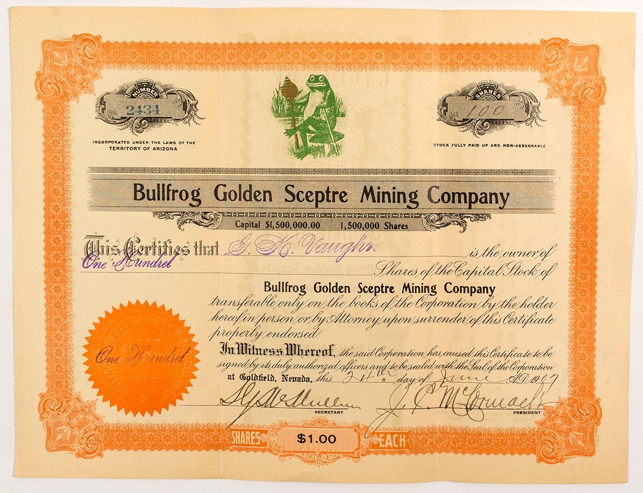 Very sought-after Bullfrog certificate. Issued in 1907 to G. Vaughn, #2434, for 100 shares. Nice bullfrog vignette holding a gold sceptre. Signed by president. 8.25" x 11". According to The Mining Investor 1907, "work is being continued in the new Golden Sceptre tunnel with three shifts of miners steadily driving into the hill." City: Bullfrog State: Nevada Date: 1907 HWAC# 51639