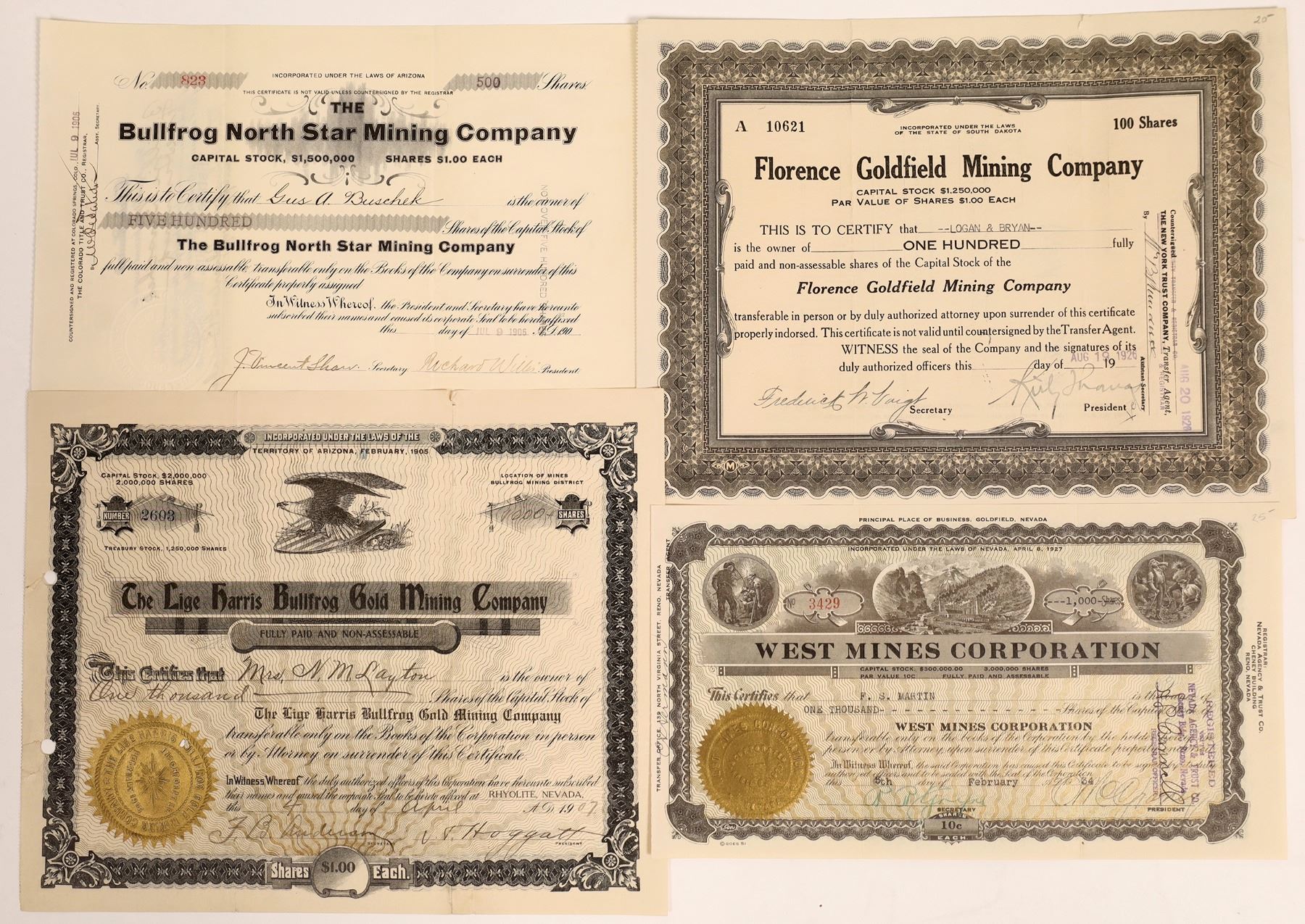 Lot of 4 different. 1) Bullfrog North Star Mining Company. Issued in 1906, not cancelled. Folds. 2) The Lige Harris Bullfrog Gold Mining Company. Issued in Rhyolite in 1907. Punch cancelled. Eagle vignette. Folds with some separation. 3) Florence Goldfield Mining Company. Issued in 1926, not cancelled. Many pinholes, folds. 4) West Mines Corporation. Goldfield. Issued in 1934, not cancelled. Mining vignettes. Folds.