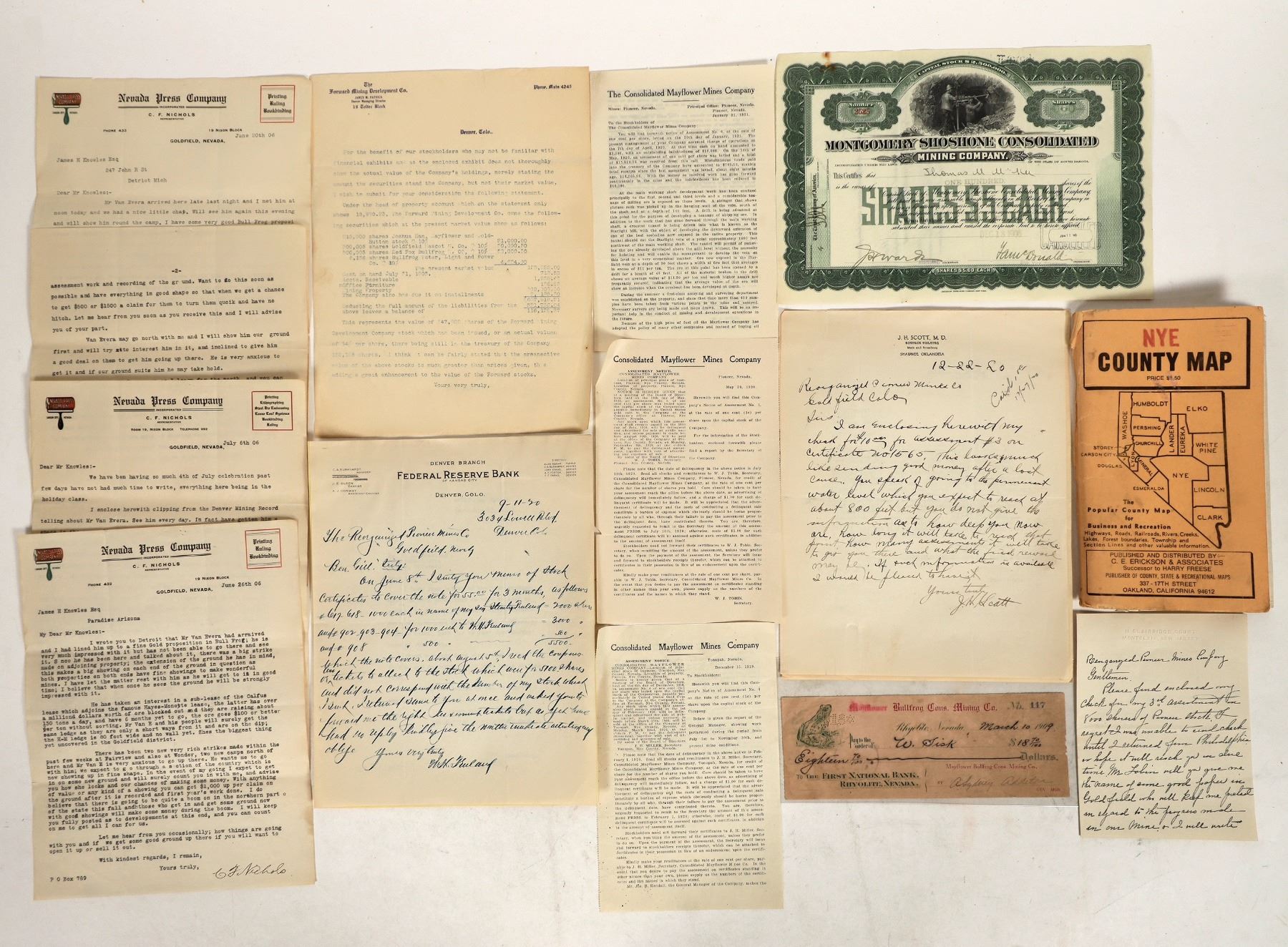 Lot of 13. Includes: Nye County map (CE Erickson & Associates); Montgomery Shoshone Cons. Mining Co. stock (1906); rare Mayflower Bullfrog Cons. Mining Co. check, Rhyolite (1909); assessment notices for Cons. Mayflower Mines Co., 1906; and various letterheads, incl. Forward Mining Dev. Co., Nevada Press Company (Goldfield), and the Denver Federal Reserve Bank to the Reorganized Pioneer MC. Please inspect.