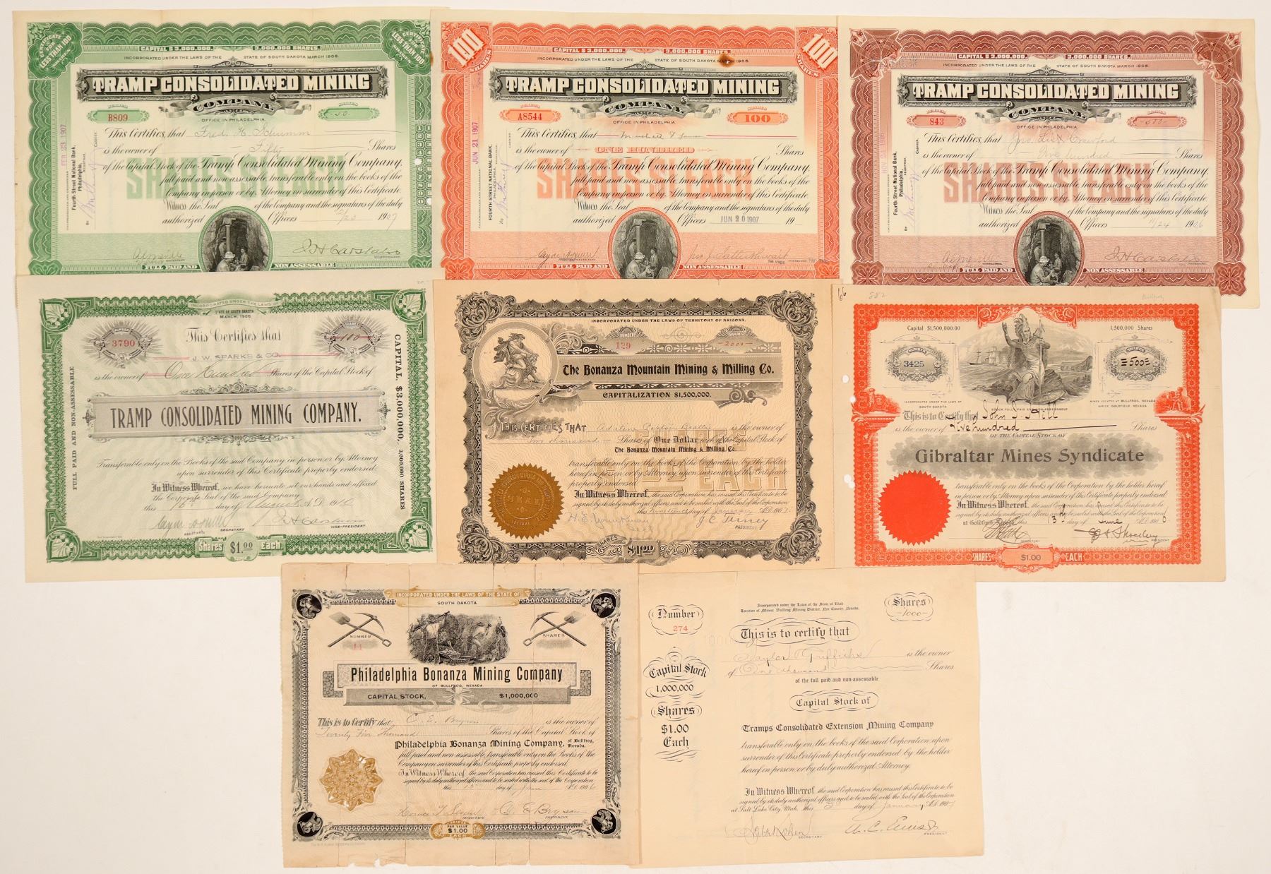 Lot of 8. 1) Gibraltar Mines Syndicate. Issued in 1906 for 500 shares. Punch cancelled. Red border and Native American vignette. Pinholes, folds. 2) The Bonanza Mountain Mining & Milling Company. Issued for 2,000 shares in 1907. Not cancelled. Black border and print, allegorical vignette. Pinholes, folds, light wear. 3) Philadelphia Bonanza Mining Company. Issued in 1906 for 25,000 shares to the company president. Multiple mining vignettes. Poor condition with rips and huge repairs to back. As is. 4) Tramp Consolidated Mining Company. Four different, issued 1906, 1907 (x2), and 1910. Pinholes and folds. Three have a mining vignette. 5) Tramps Consolidated Extension Mining Company. Issued in 1907 for 1,00 shares. Not cancelled. Folds with separation. State: Nevada City: Bullfrog Date: 1906-1910
