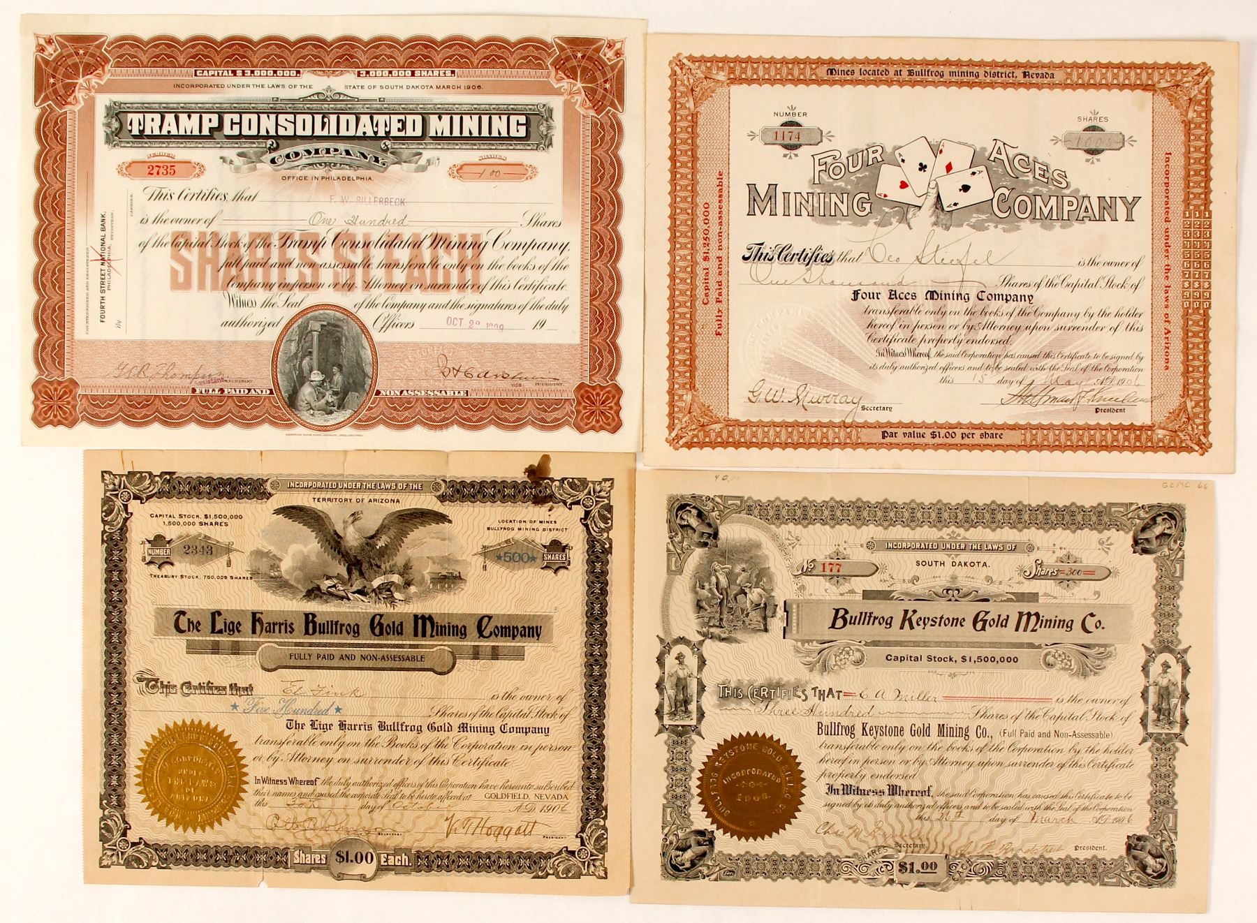 Lot of 4 different. 1) Four Aces Mining Company. Mines located at Bullfrog Mining District, Nevada. Issued in 1906 for 1,00 shares. Great vignette of hand holding four aces. Not cancelled. Not common. Pinholes, folds, some toning. 2) The Lige Harris Bullfrog Gold Mining Company. Location printed on certificate. Issued in Goldfield in 1906. Eagle vignette. Not cancelled. Signed by V. Hoggatt, one of the Bullfrog pioneers. Folds, toning, some separation, other light wear. 3) Bullfrog Keystone Gold Mining Co. Issued 1906. Not cancelled. Multiple mining vignettes. Pinholes, folds. 4) Tramp Consolidated Mining Company. Issued 1909. Not cancelled. Underground mining vignette. Folds. State: Nevada City: Bullfrog Date: 1906-1909 Al Adams Collection. HWAC# 58403