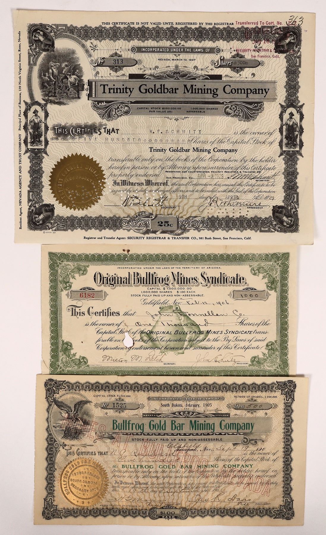 Lot of 3 different. 1) Original Bullfrog Mines Syndicate. One of the classic Bullfrog stocks with vignette of green bullfrog. This one is damaged (portion missing near seal). Issued in Goldfield in 1906 to John Donnellan Co. for 1,000 shares. Signed by president John Lutz and secretary Milton Detch. 5.5 x 9.25" 2) Bullfrog Gold Bar Mining Company. "Mines at Bullfrog, Nevada" in red underprint. Issued in Goldfield in 1906 for 500 shares. Signed by vice president Jas. R. Davis and the asst. secretary. Not cancelled. Black border, gold seal, and green print with eagle vignette. 5.5 x 10" 3) Trinity Goldbar Mining Company. Issued in 1929 for 500 shares. Signed by president JR Whitmore and secretary Schmitt. Punch cancelled. Multiple mining vignettes. 8.5 x 10.75" Bullfrog is now a ghost town in Nye County, Nevada. Located about 4 miles west of Beatty and less than 1 mile from the ghost town of Rhyolite.