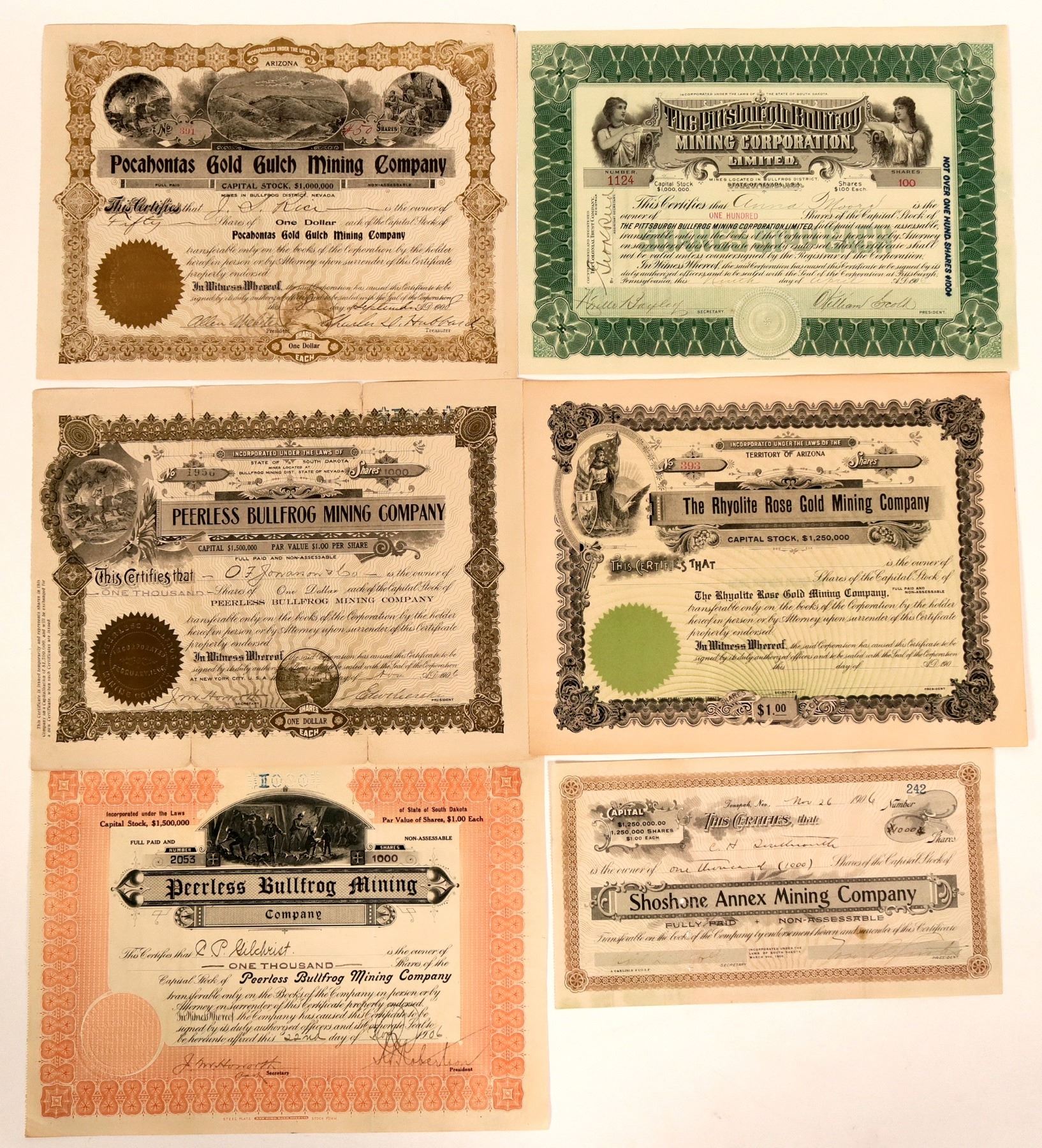 Six Bullfrog district certificates. The most rare is the Shoshone Annex Mining Company, issued in 1906. This company was listed in the Rhyolite Herald in 1909 (Filer II). Very good condition. Uncancelled. Also rare is Pocahontas Gold Gulch Mining Company issued in 1908. States mines in Bullfrog District, Nevada on the masthead. Other stocks include Pittsburgh Bullfrog Mining Corporation, Ltd., 1906, Peerless Bullfrog Mining Company, orange variety, 1906, Peerless Bullfrog Mining Company, issued 1906, Goes variety with large fold splits, and an unissued Rhyolite Rose Gold Mining Company certificate. State: Nevada City: Bullfrog Date: 1906-1909