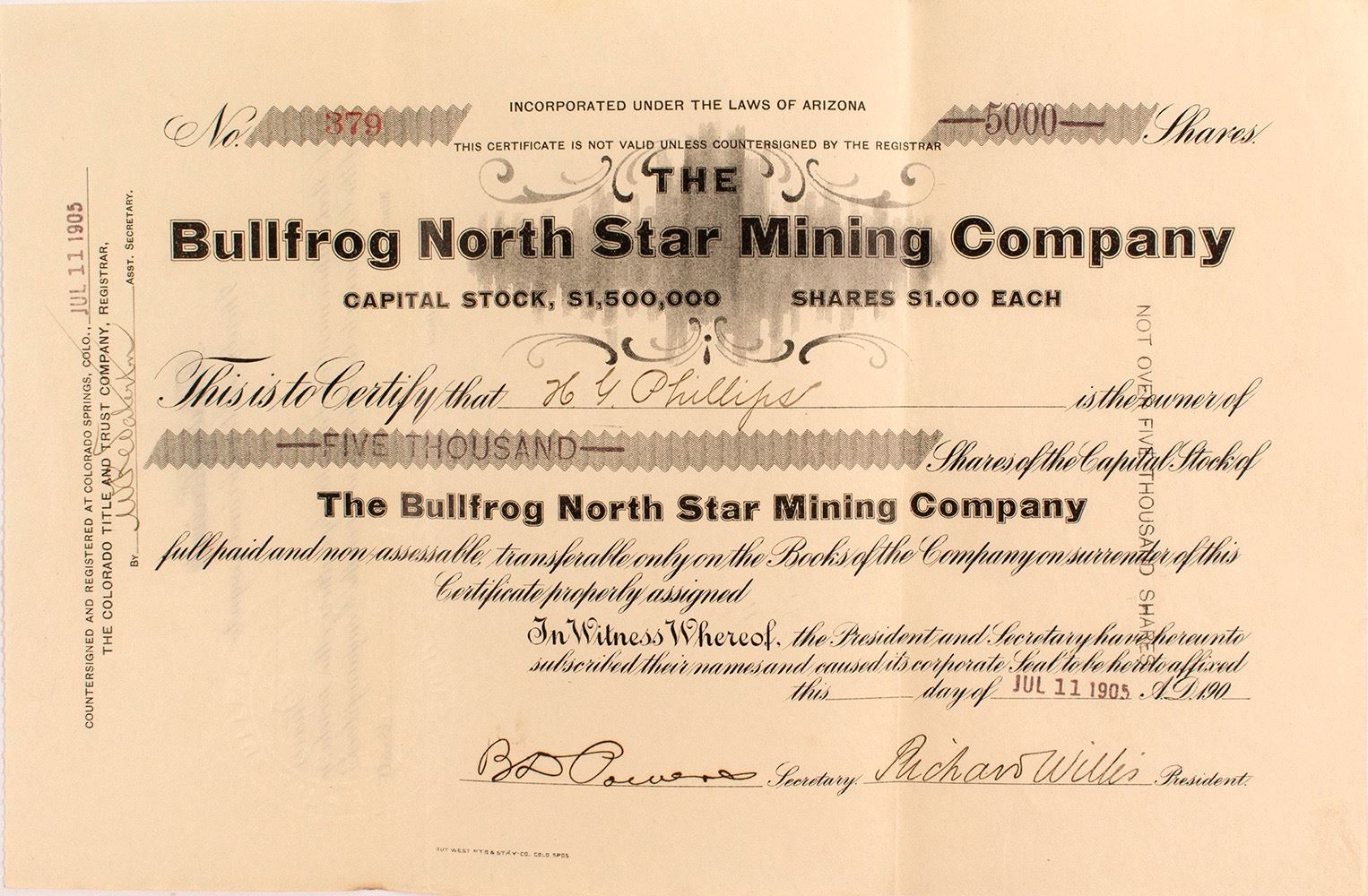 Issued 1905 to H. Phillips #379 5000 shares. Signed by president Willis. 6.5" x 10". This mine was located on the south end of Ladd Mountain. Possibly named after the famous North Star Mine in Grass Valley. No production details available. City: Bullfrog State: Nevada Date: 1905 HWAC # 52259