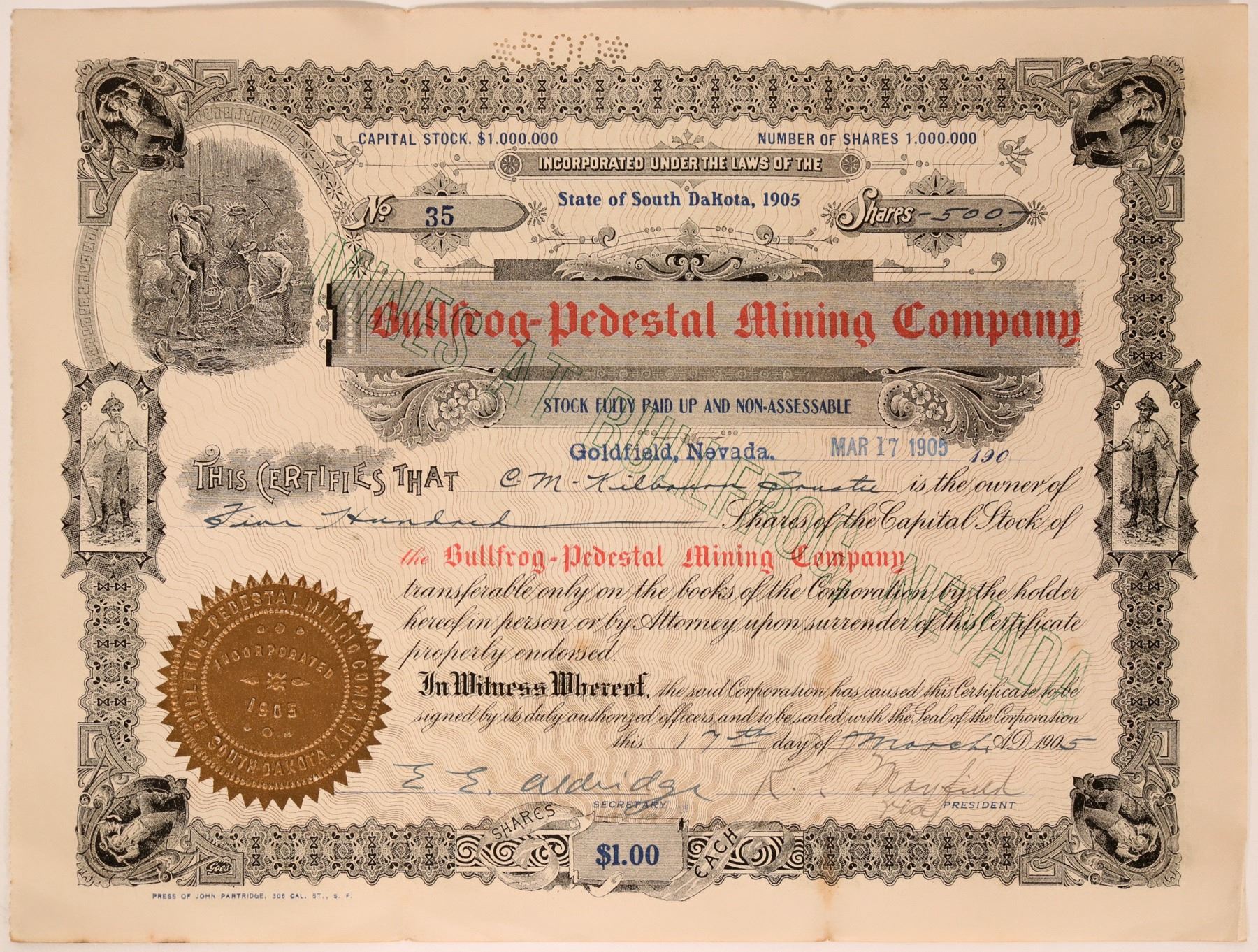 Cert. #35. Issued 1905 at Goldfield, NV. Inc. in S.D. "MINES AT BULLFROG NEVADA" printed diagonally across certificate. Seven mining vignettes. Some browning along the bottom of the right fold line and on back of fold. Uncancelled. State: Nevada City: Bullfrog Date: 1905
