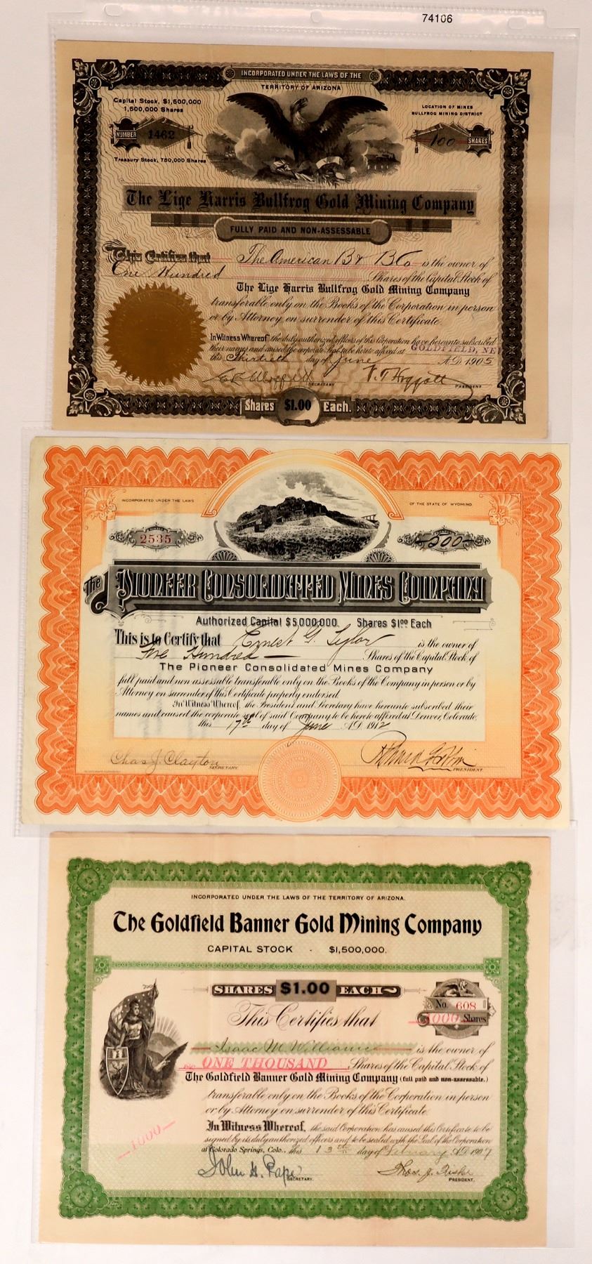 Lot of three. 1) Lige Harris Bullfrog Gold. 1905. Datelined Goldfield. President Hoggatt was an activist that convinced President T. Roosevelt to open Federal land to farmers and ranchers in Alaska. It cost him a giant moose head. Lige Harris (namesake) made the original Bullfrog discovery, The stock was active in 1906, but by 1909 was sold by the sheriff for taxes. 2) Goldfield Banner Gold. 1907. Datelined Colorado Springs. Gold and silver mine with 80 acres of land. 3) Pioneer Consolidated. 1912. #2535 for 200 shares. Pioneer was within a couple of miles to Bullfrog. Datelines Denver.