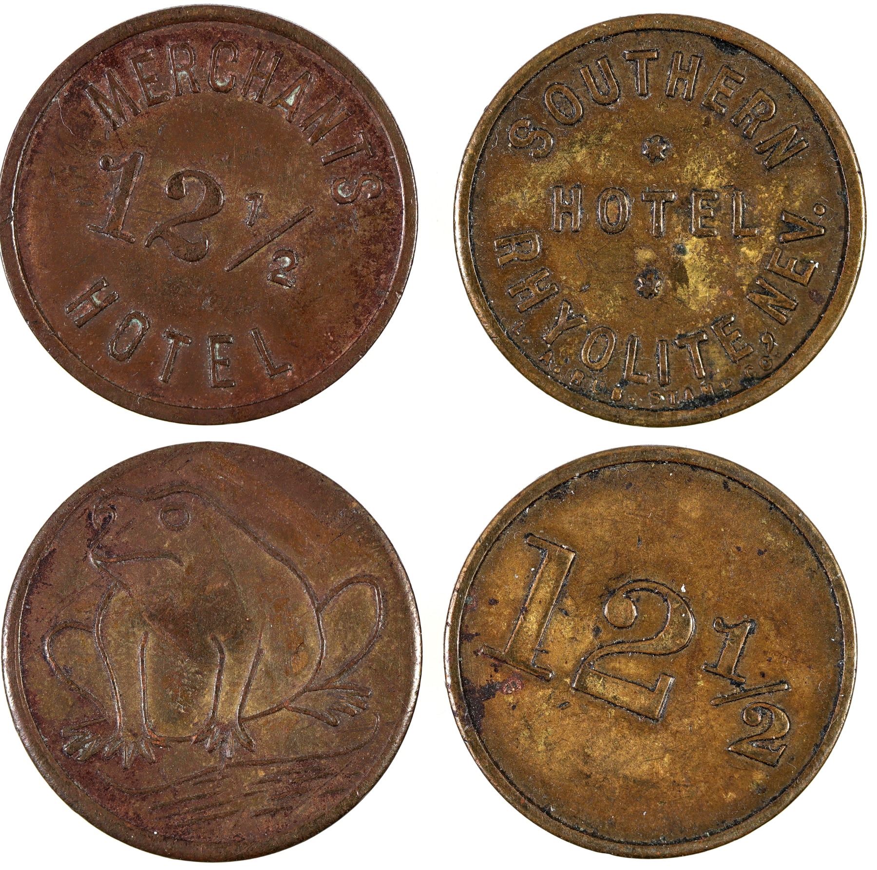 Lot of two rare tokens: 1) SOUTHERN / HOTEL / RHYOLITE, NEV. / L.A. RUB. STAMP CO. // 12.5; Br., rd., 21 mm. 2) MERCHANTS / 12.5 / HOTEL // (bullfrog); Br. rd., 21 mm.