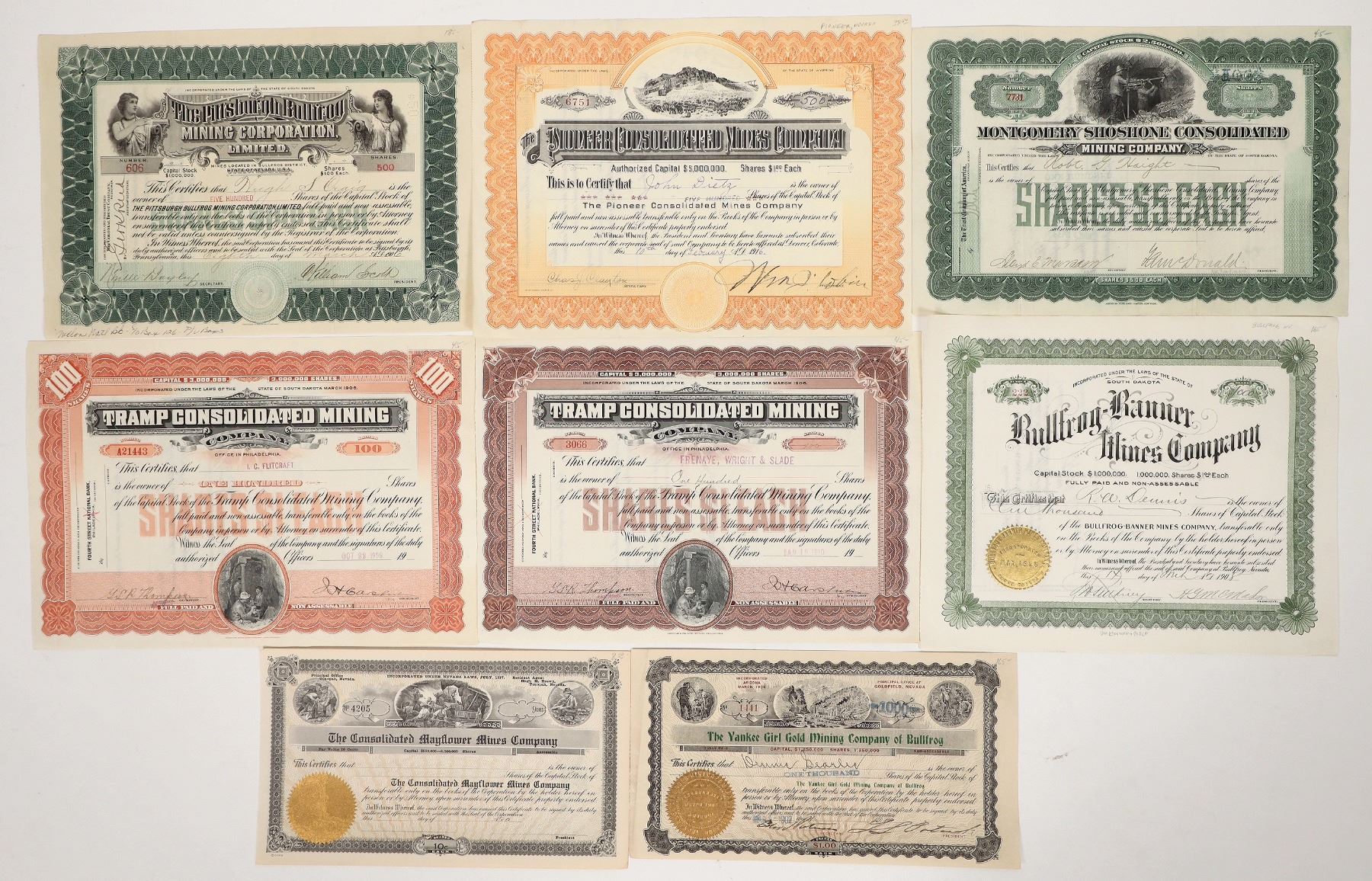 Issued-1907 Yankee Girl Gold Mining of Bullfrog in nice froggy green!, 1906 Pittsburgh Bullfrog, 1916 Pioneer Cons., 1909 and 1910 Tramp Cons., 1910 Montgomery Shoshone, 1908 green Bullfrog-Banner. Unissued Cons. Mayflower.