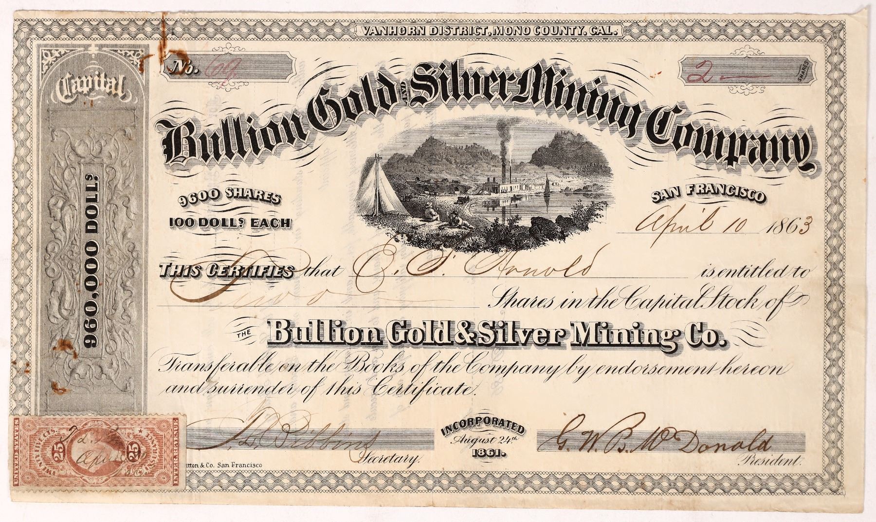 Bullion Gold & Silver Mining Company, Van Horn District, Mono County, California. Certificate #69 for 2 shares at $100 each, issued to E. Arnold on Apr 10, 1863 in San Francisco. Signed by secretary Bibbins and president B.W.B. McDonald. Vignette of mill on lake shore with resting miners. Black border and print by Britton & Co, SF. 25c adhesive revenue stamp left bottom.