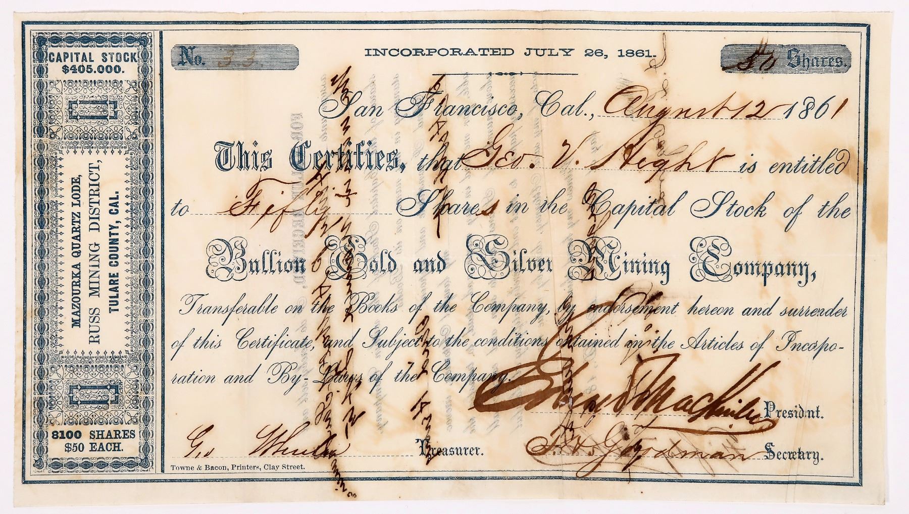 "Mazourka Quartz Lode, Russ Mining District, Tulare County, Cal." (printed on the left border). Inc. July 26, 1861. No. 33, issued for 50 shares to Geo. V. Hight in San Francisco on August 12th, 1861. Signed by president Edward Mackinley, Secretary T.H. Goodman, and treasurer Geo. Wheeler. Not cancelled. Pen ink transfer on reverse. Blue ink, Towne & Bacon Printers. 5.25 x 9.5" Folds, toning from the ink.