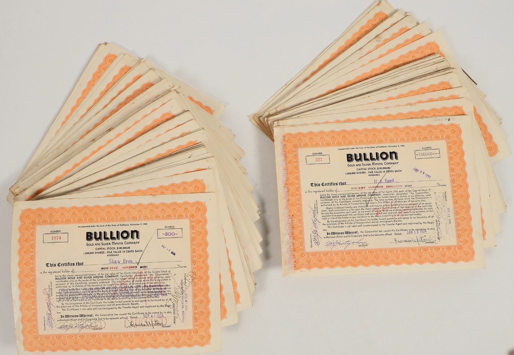 This is a group of stocks for the Bullion Gold and Silver Mine Co.. There are two stocks issued for 100,000 shares each. Please see photo for details.