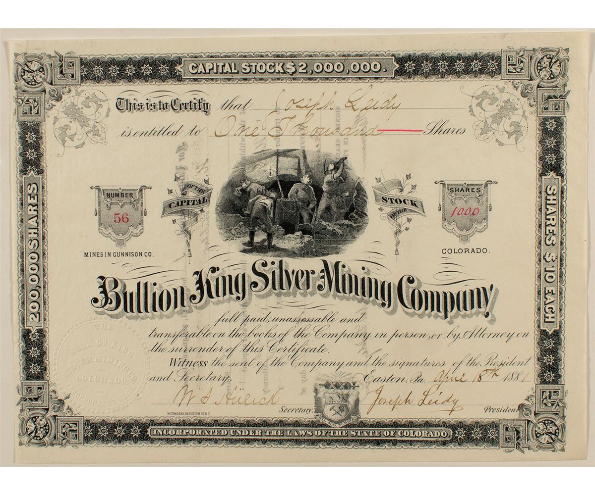 Inc. in Colorado in 1881. No. 56. Uncancelled. Issued for 1000 shares to Joseph Leidy on Apr. 18th, 1881 in Easton, PA. Signed by Leidy (as president) and M.S. Hulick (secretary). Signed on reverse by Leidy. Vignette of four miners working underground. Company seal lower left. Printer: W.E. Badeau, N.Y. Certificate states Mines in Gunnison Co., Colorado. This mine was located in the western part of the Elk Mountain Range in the Ruby Silver belt. Through the early 1880s, its reported production was small (225 tons of rich silver ore in 1881). Listed as an important mine by Burchard. Measures 10 ¾" x 8." Condition: very nice.City: County: GunnisonState: CODate: 1881