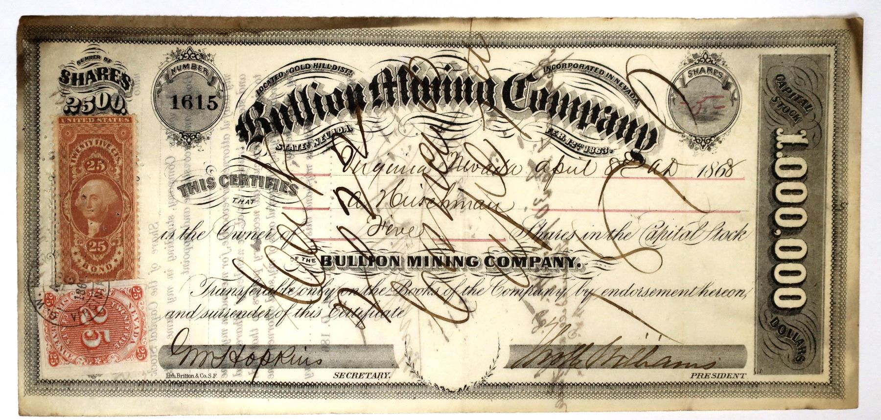 # 1615 for 5 shares to A. Hirschman(?) on April 8, 1868 in Virginia, Nevada. Incorporated on February 12, 1863. "Located at Gold Hill District, state of Nevada" on certificate. The claim actually goes into the Virginia Mining District. 25c United States Bond revenue stamp. Most importantly has a scarce Nevada SCARLET VERMILION ROULETTE 25c REVENUE stamp. Britton & Co. printer. Hand cancelled. Discoloration on edges. Pin holes. Reverse has assessment stamps numbered 31 and 32. Signed by president Thomas H. Williams. Williams was considered one of the smartest lawyers on the Comstock. He made a fortune with a mine he got in a sheriff's sale, turned it into Consolidated Virginia stock, sold that at the top of the market and invested that money into California land. It is said that he and his partner were the only lawyers who made a fortune on Comstock mining and didn't lose it! Biography on Williams and history of the Bullion included.