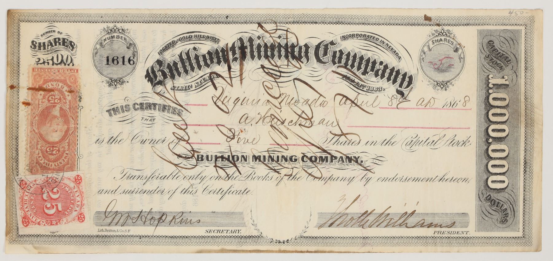 A nice, fairly clean example! No. 1616, issued to A. Hirschman in Virginia City, Nevada in 1868. Signed by president Williams and secretary GW Hopkins. Red 25 cent Nevada adhesive stamp plus 25 cent US IR. Pinholes, folds. Adolph Hirschman was a jeweler in Virginia City and close friend of John Mackay. He relocated his shop to San Francisco and Mackay would visit him often when Mackay had also settled in SF. The Bullion Mine, staked in 1859, was located 1/2 mile north of Gold Hill on the north side of Bullion Ravine. It was promising property because it had rich Comstock mines on either side: the Chollar-Potosi and Consolidated Imperial. The Bullion absorbed the Corser, Eastern Slope, Wellington, and Fairview claims; 944 ft. total. No recorded production, even though the mine was operated from 1862 to the early 1900s. John Mackay was first a trustee of the mine in 1863, then superintendent in the late 1860s.