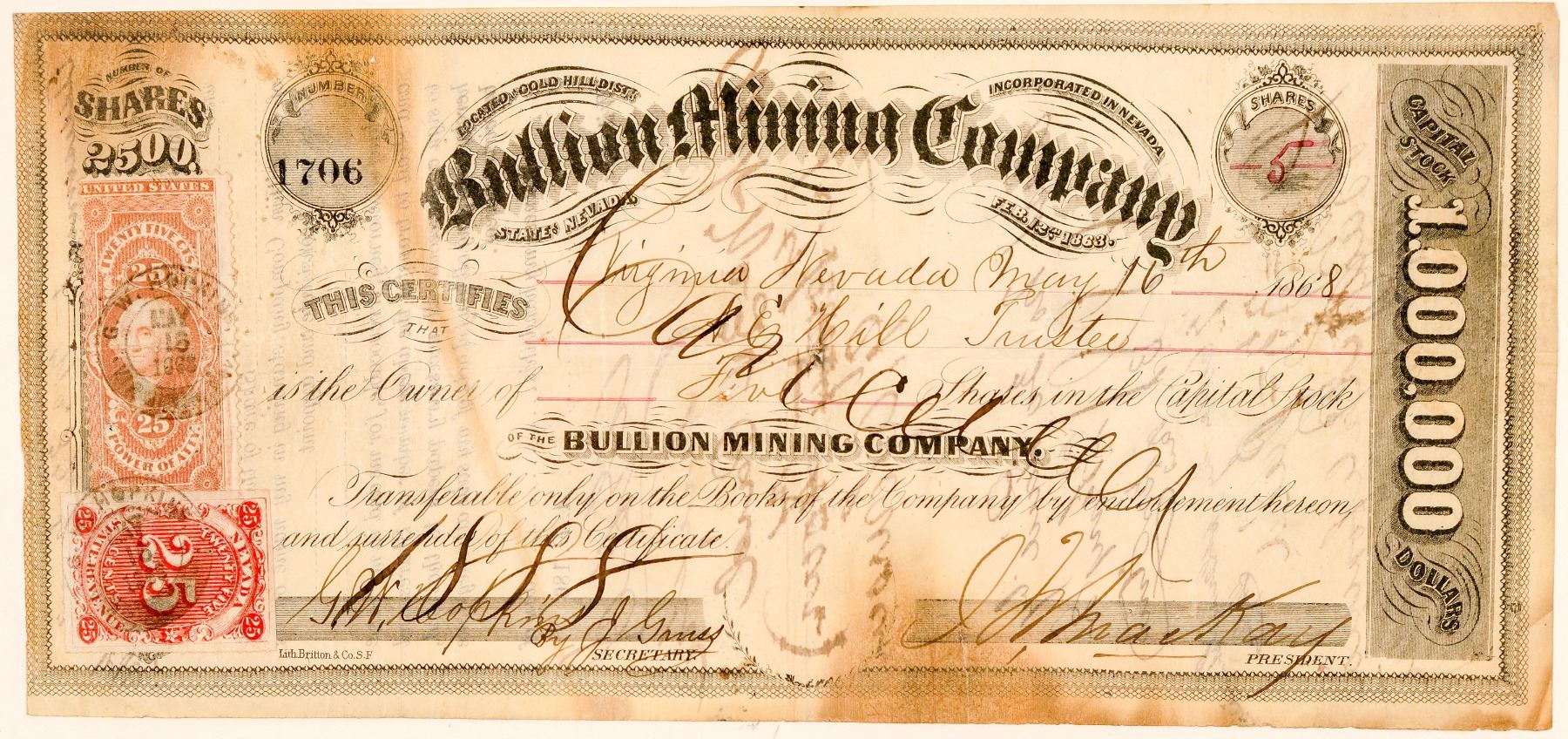 Phenomenal. Mackay's signature on a stock certificate is a great Comstock rarity. This stock was issued in a pivotal time for Mackay, after he had started to make a name for himself as a competent mining investor and engineer on the Comstock, but before he and the Bonanza Firm would take control of the Comstock from William Sharon and the Bank of California. Located: Gold Hill Dist., State of Nevada (printed above the title). Inc. in Nevada, Feb. 12th, 1863. No. 1706, issued for 5 shares to A.E. Hill on May 16th, 1868 in Virginia City. Signed by JW Mackay as president and GW Hopkins as secretary. Pen cancelled. Black border and print. No vignette. Lith. Britton & Co., SF. Two revenue stamps attached on the left side, both with tied cancels: 25 cent US Power of Attorney and 25 cent red Nevada. Condition: pinholes, folds, heavy staining at bottom right and top left. Reverse has many pen notations about assessments. Secretary GW Hopkins would become mayor of Virginia City in 1873. A.E. Hill was a clerk for the Bank of California. The Bullion Mine, staked in 1859, was located 1/2 mile north of Gold Hill on the north side of Bullion Ravine. It was promising property because it had rich Comstock mines on either side: the Chollar-Potosi and Consolidated Imperial. The Bullion absorbed the Corser, Eastern Slope, Wellington, and Fairview claims; 944 ft. total. No recorded production, even though the mine was operated from 1862 to the early 1900s. Mackay was first a trustee of the mine in 1863, then superintendent in the late 1860s. As a trustee, Mackay teamed up with J.M. Walker, who took on the role of supt. Unfortunately, even Walker and Mackay could not make it profitable. Before giving up, Mackay had the mine explored to a depth of 1,400 feet. Mackay's first success had come with his investment in the Kentuck in 1865. Mackay had just met James Fair a year before in 1867 when Fair was in charge of the Hale & Norcross. After Fair was dismissed from that job, he went to Idaho to explore mining opportunities, before returning to the Comstock in late 1868. In 1871, Mackay, Fair, Flood, & O'Brien used money made from the Hale & Norcross to start acquiring multiple Comstock mines, including the Con-Virginia. This mine would be the site of the Big Bonanza discovery in 1873 and cement their status as the "Bonanza Kings" of the Comstock. [Ref:Ansari; John Mackay: Silver King, Makley] () Ken Prag Collection