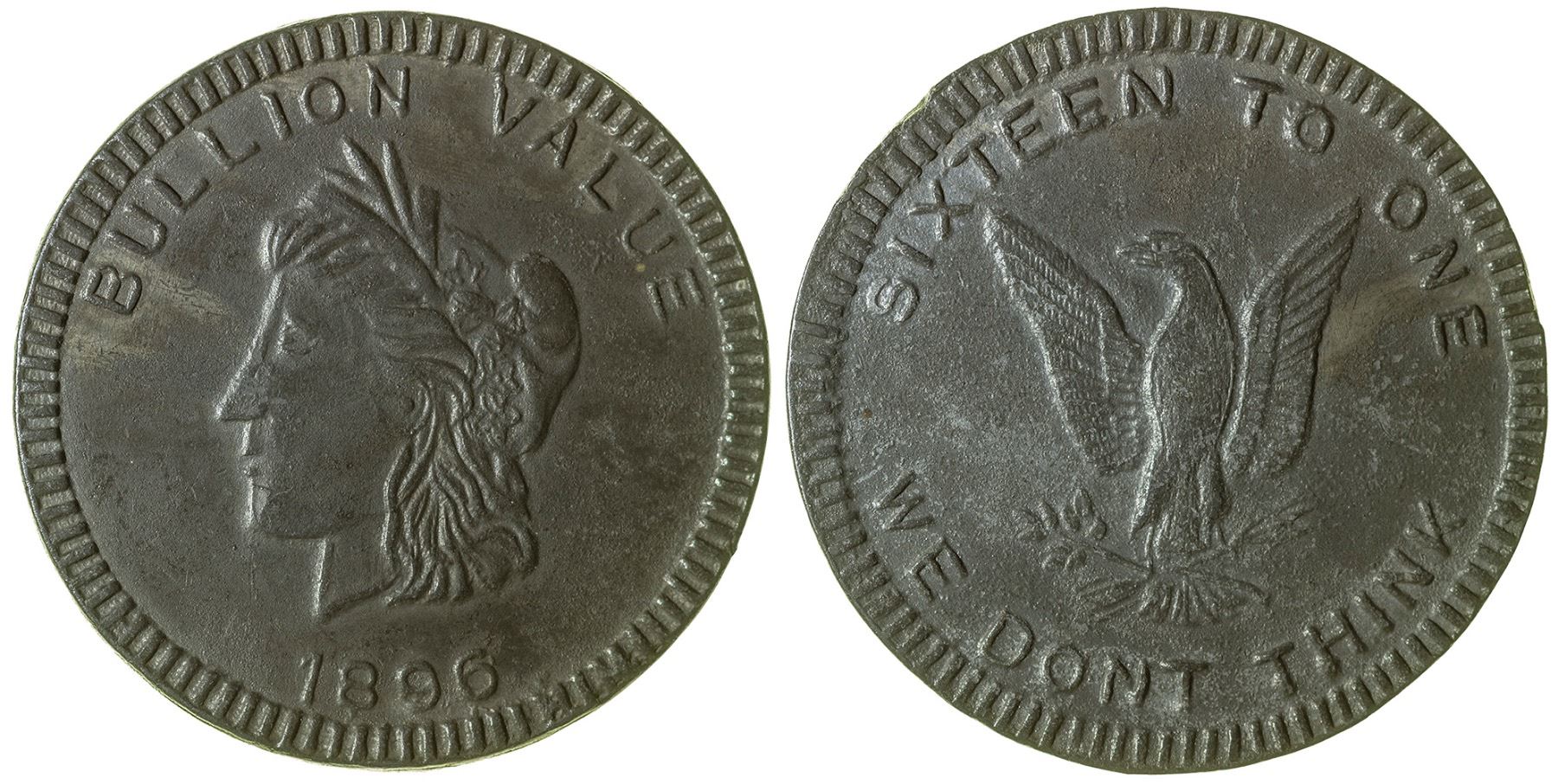 Schornstein 852. Pointy nose, squared chin, 64mm, 75 grams. Obv.: Bullion Value / 1896; Rev.: Sixteen to One / We Don't Think. City: State: Date: HWAC# 52400
