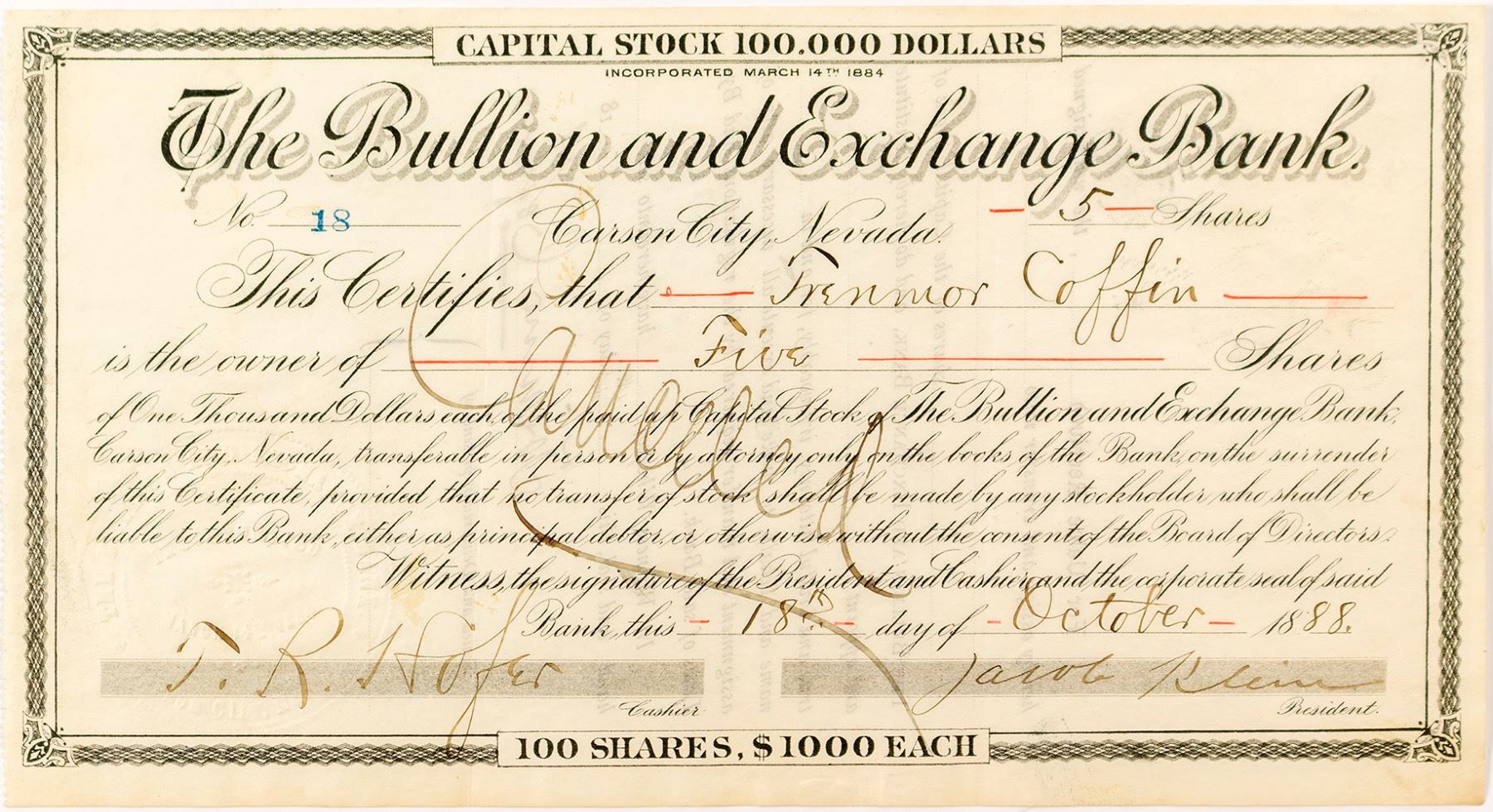 Bullion and Exchange Bank Certificate to Trenmor Coffin