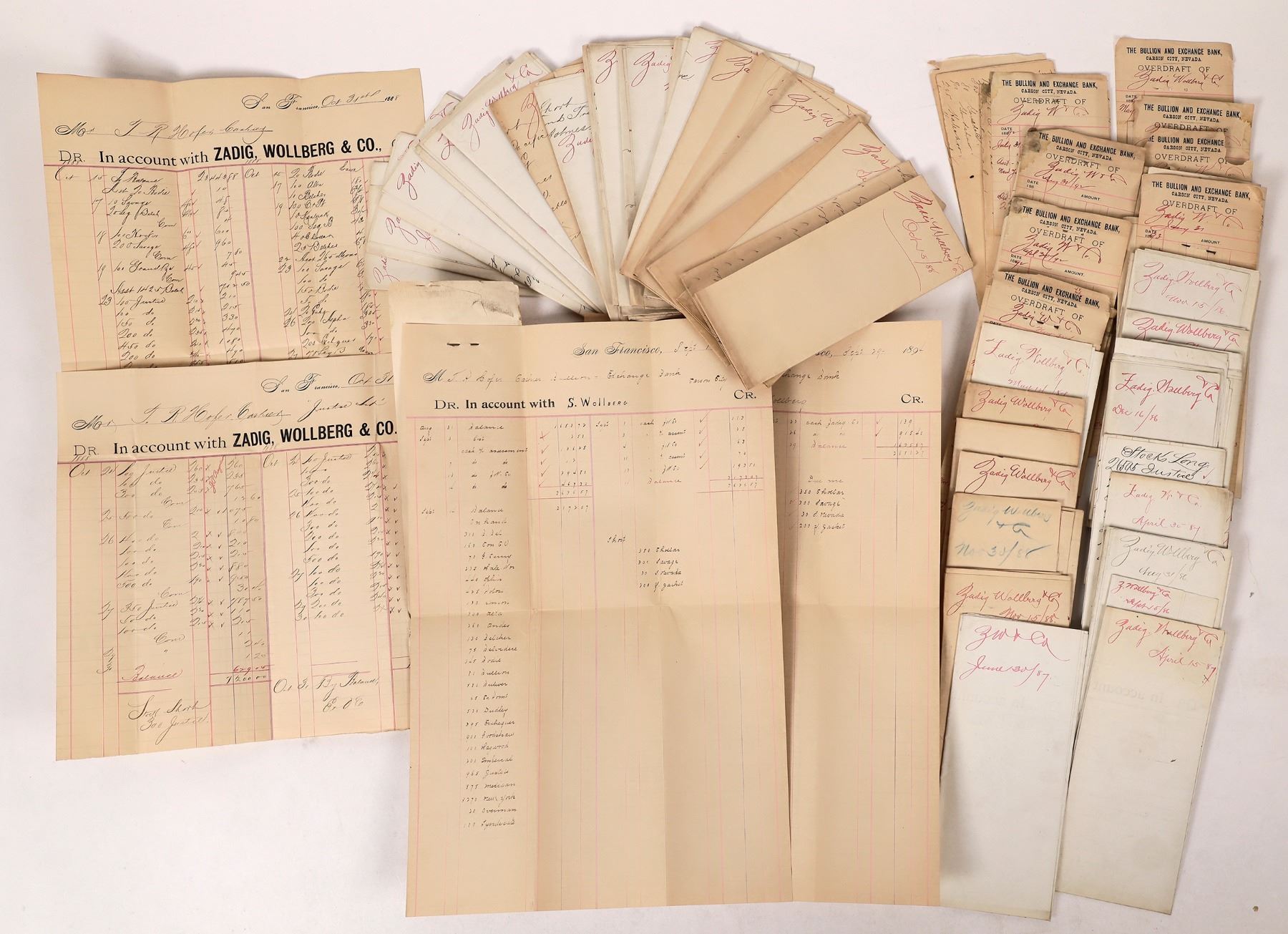 52 Bullion and Exchange bank ledgers, c. 1880's-90's. They used a stock broker on the San Francisco Stock and Exchange Board for these transaction, featuring mines in Bodie, CA and Virginia City, NV. Each sheet shows the names of mining companies, and number of shares bought by the bank in Carson using this San Francisco broker. Mines of note include Ophir, Potosi and Con. California and Virginia in Virginia City and Navajo in Tuscarora, Mono in Bodie etc. A nice record of stock transfers.