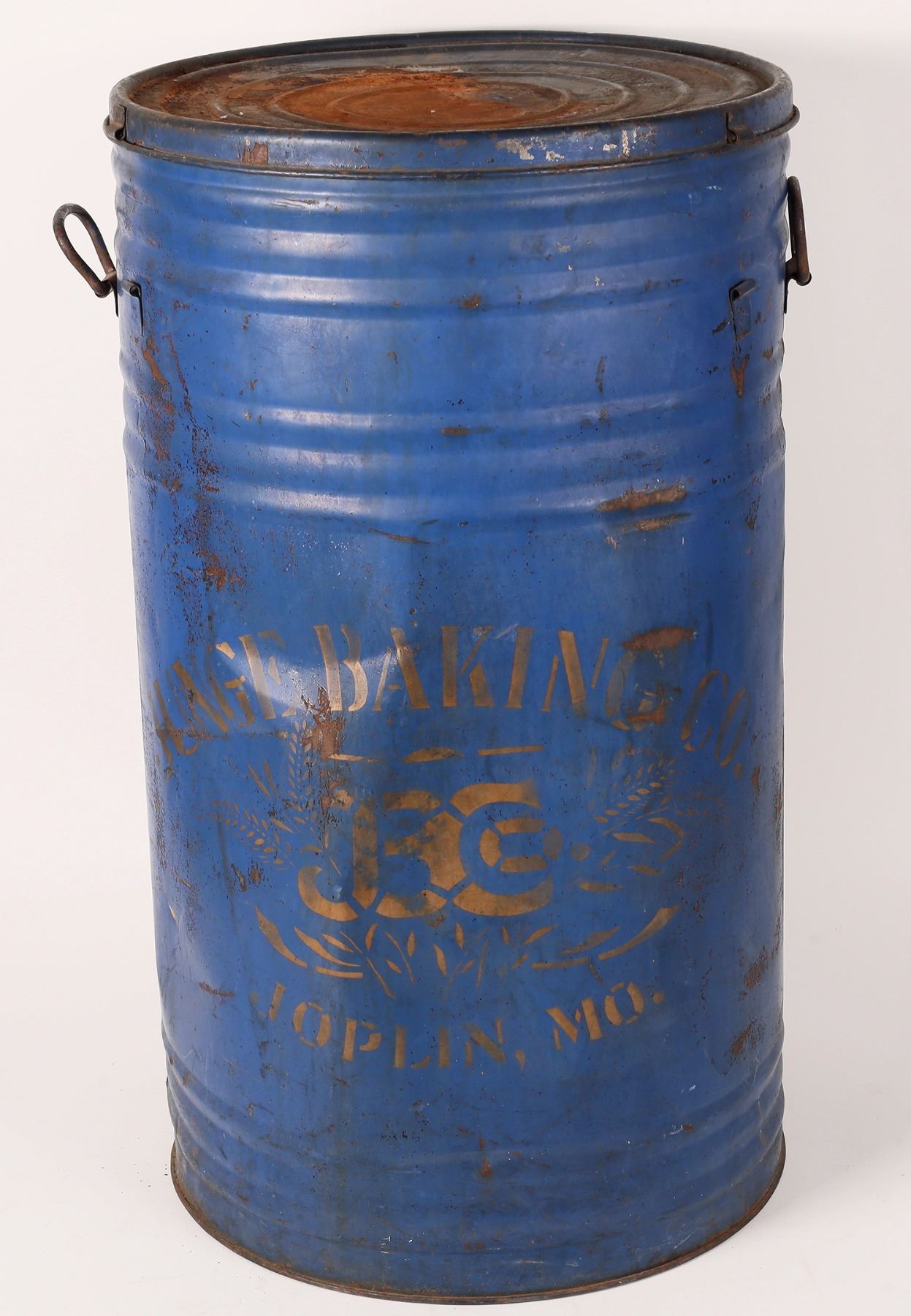 Large (27"x 15") flour bin put out by Junge Baking Company of Joplin, Missouri. This blue metal container is stenciled with "Junge Baking C0. the company logo and a wheat stalk design in gold. Thinking this will hold about 50 pounds of product. There are some rust and dent issues, but it is still attractive for use as a decorative item or...store flour in it. Please see photos for more details. Joplin Missouri Gary Bracken Collection