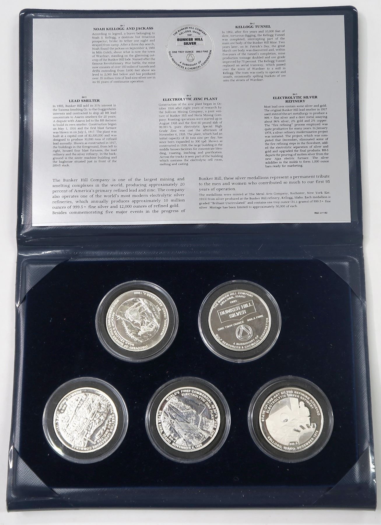 Issued by the Bunker Hill Company of Kellogg Idaho, case of five one troy ounce, 999.5 (!) fine. These silver medallions depict: the Kellogg Tunnel; the Lead Smelter; the Electrolytic Zinc Plant; the Electrolytic Silver Refinery; and Noah Kellogg and Jackass. All brilliant uncirculated and minted at the Metal Arts Company, Rochester New Yrok.